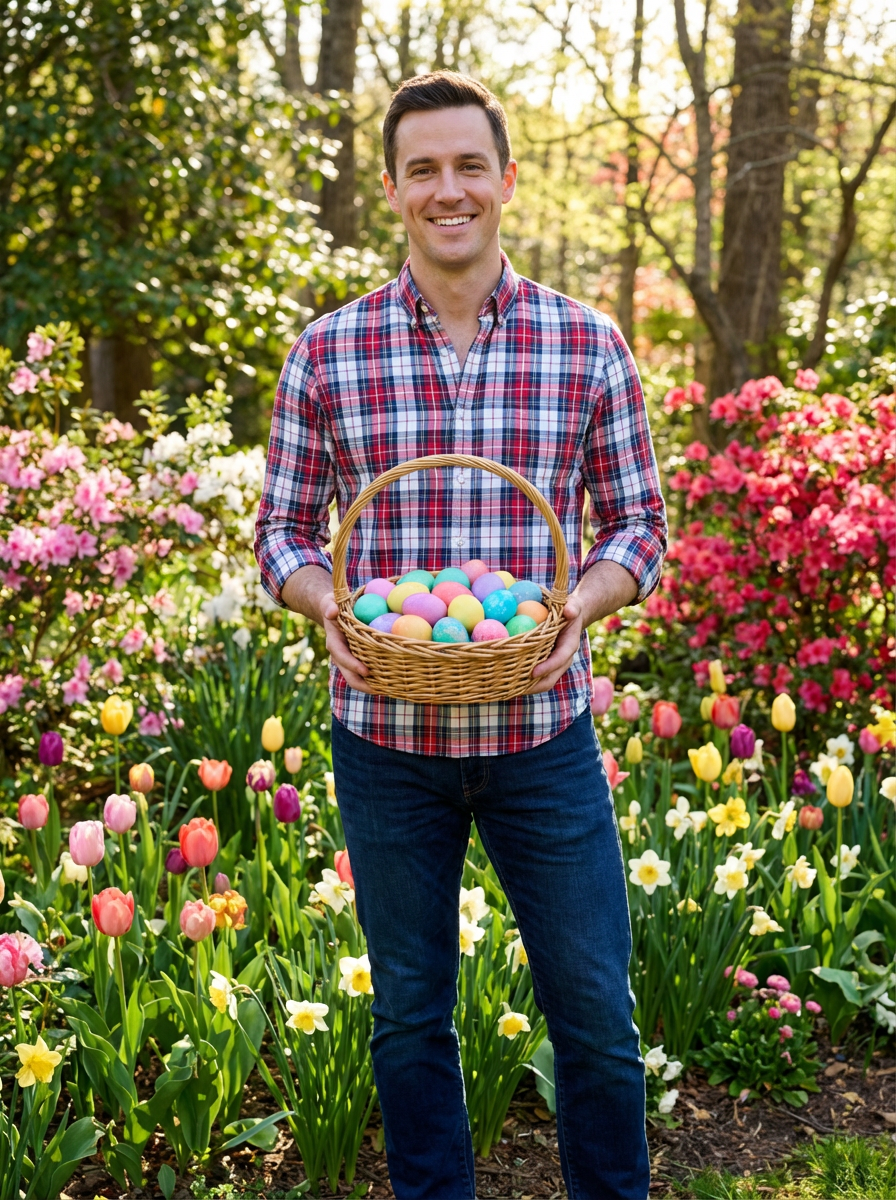 A model holding a basket filled with colorful Easter eggs, standing in a vibrant garden full of spring blooms.