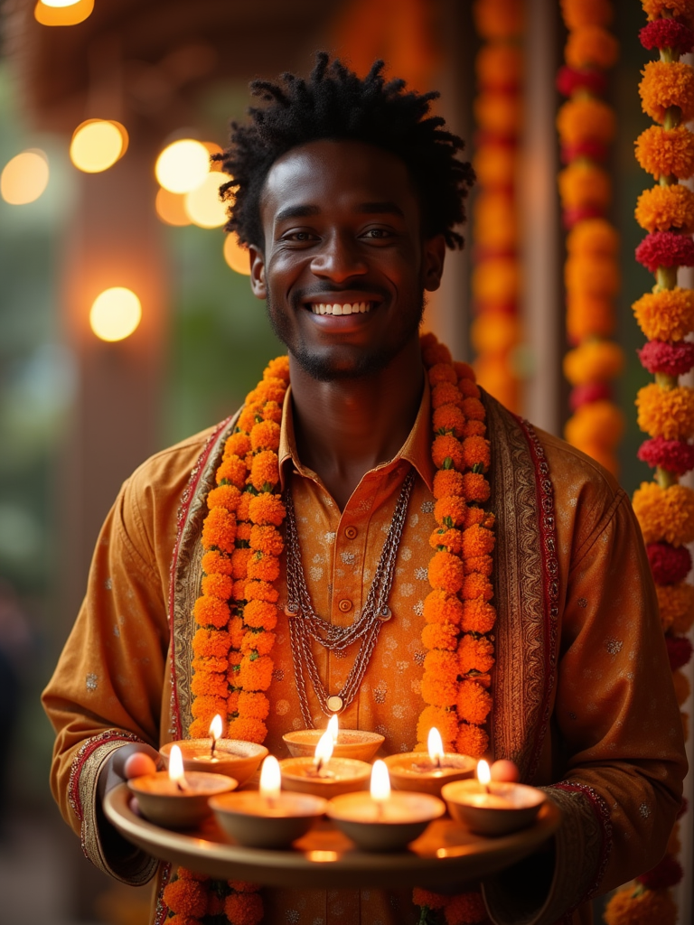 A model holding a thali (plate) with diyas, wearing ethnic attire, and smiling against a backdrop of decorative lights and marigold garlands.