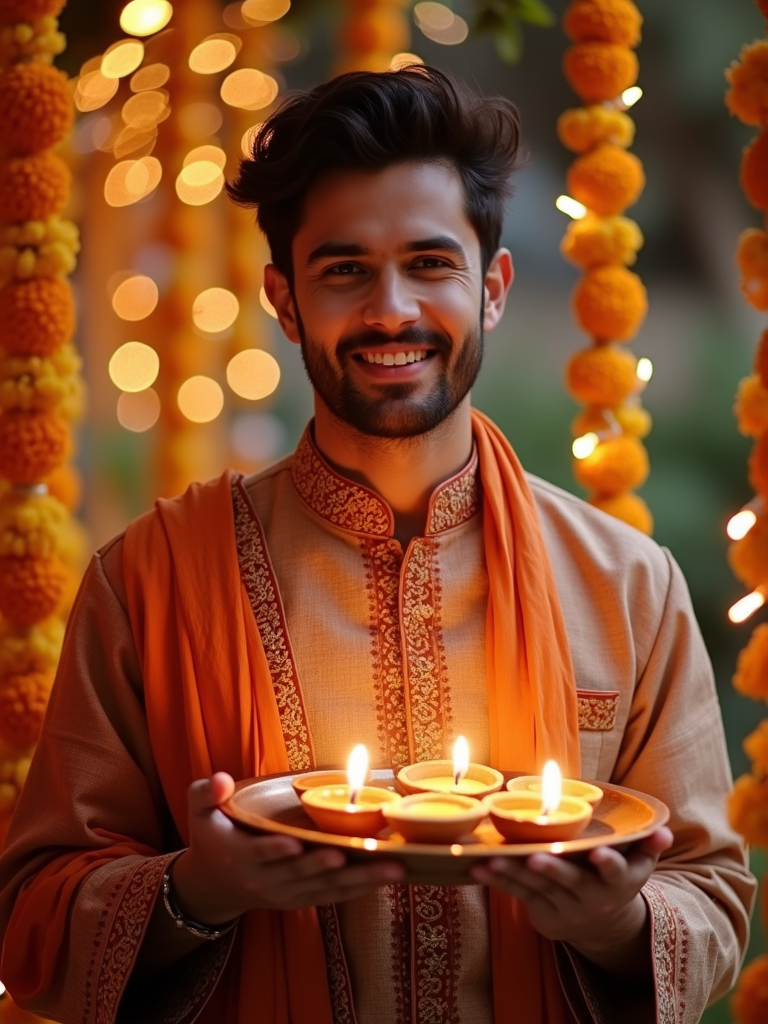 A model holding a thali (plate) with diyas, wearing ethnic attire, and smiling against a backdrop of decorative lights and marigold garlands.