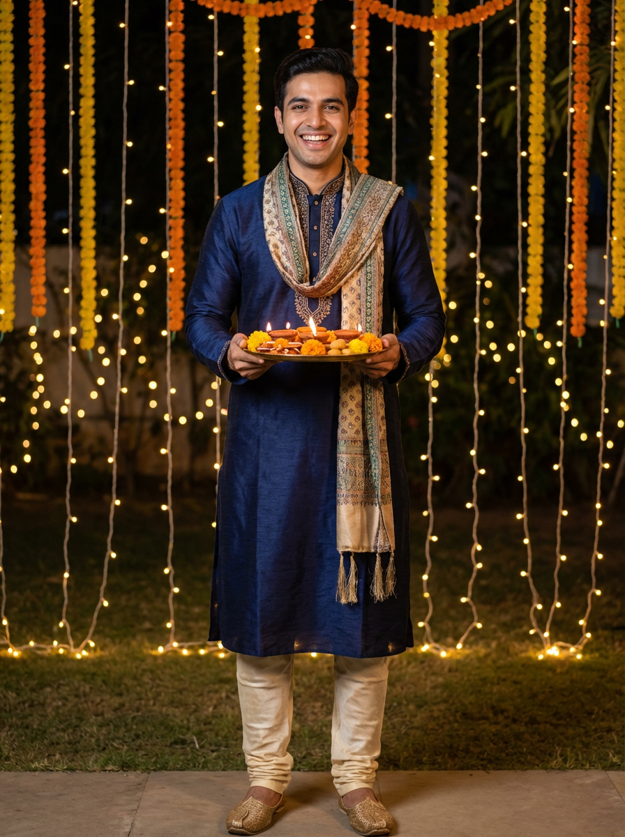 A model holding a thali (plate) with diyas, wearing ethnic attire, and smiling against a backdrop of decorative lights and marigold garlands.