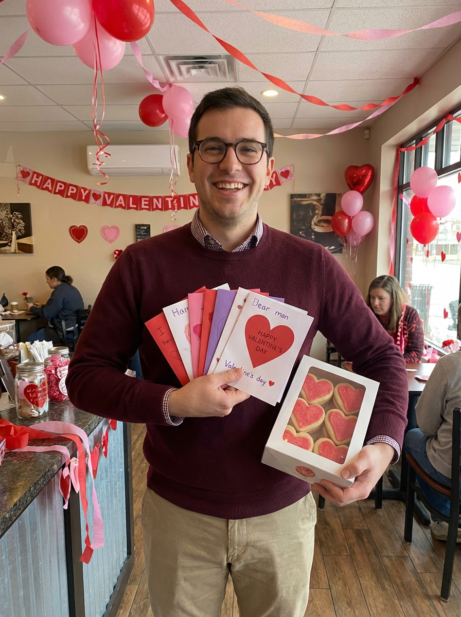 A model holding Valentine's cards and heart-shaped treats in a fun, festive Valentine's setting.