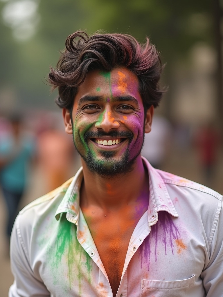 a model in a casual white shirt, capturing their infectious energy during Holi, with their face and clothes beautifully decorated with green, orange, and purple colors