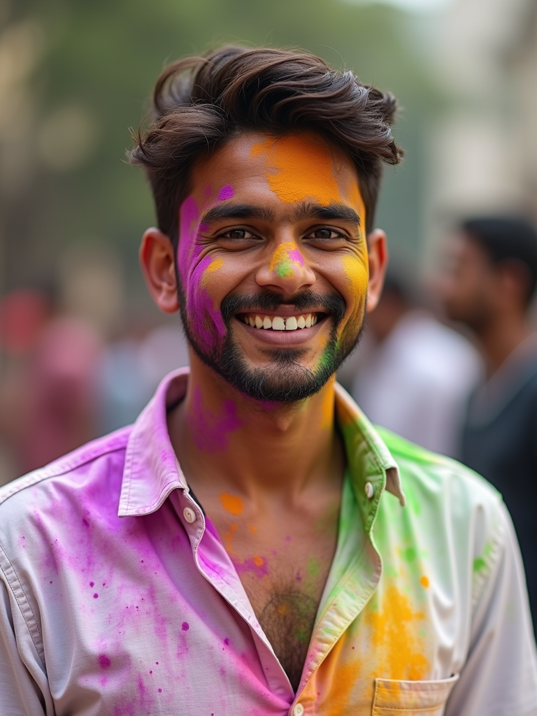 a model in a casual white shirt, capturing their infectious energy during Holi, with their face and clothes beautifully decorated with green, orange, and purple colors