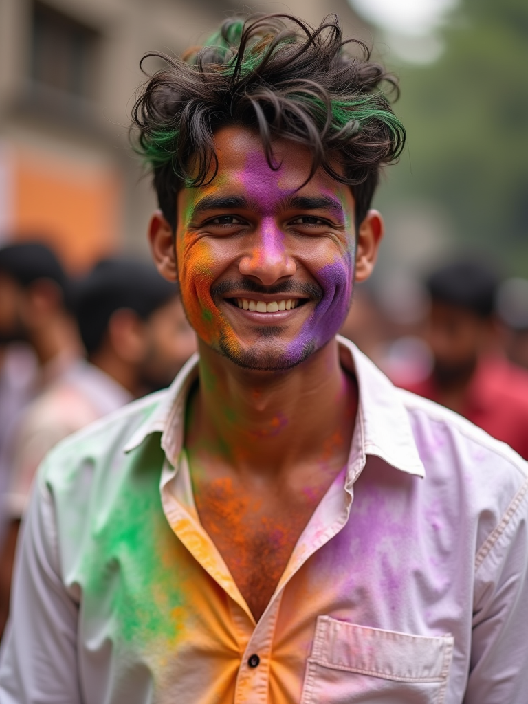 a model in a casual white shirt, capturing their infectious energy during Holi, with their face and clothes beautifully decorated with green, orange, and purple colors