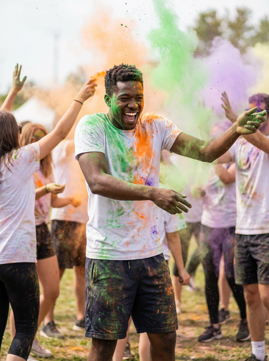 a model in a casual white shirt, capturing their infectious energy during Holi, with their face and clothes beautifully decorated with green, orange, and purple colors