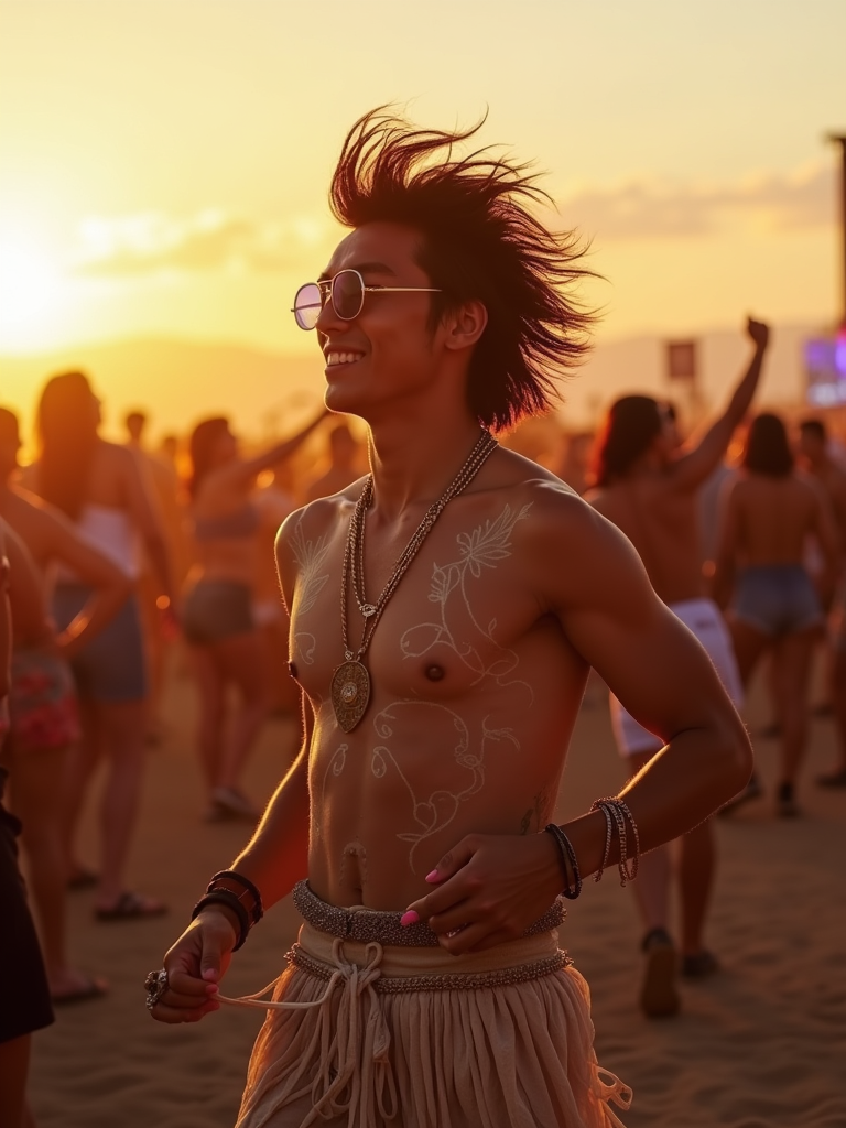 a model in a Coachella-inspired outfit, dancing with a crowd of fellow festival-goers, capturing the energetic atmosphere of the main stage at sunset