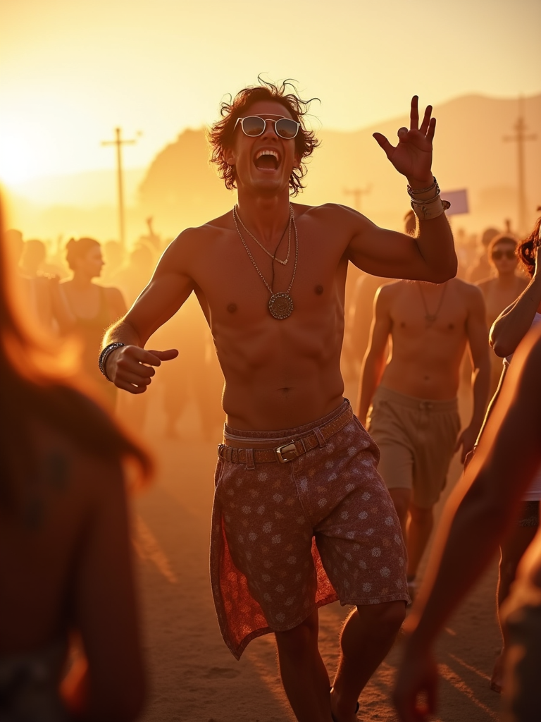 a model in a Coachella-inspired outfit, dancing with a crowd of fellow festival-goers, capturing the energetic atmosphere of the main stage at sunset