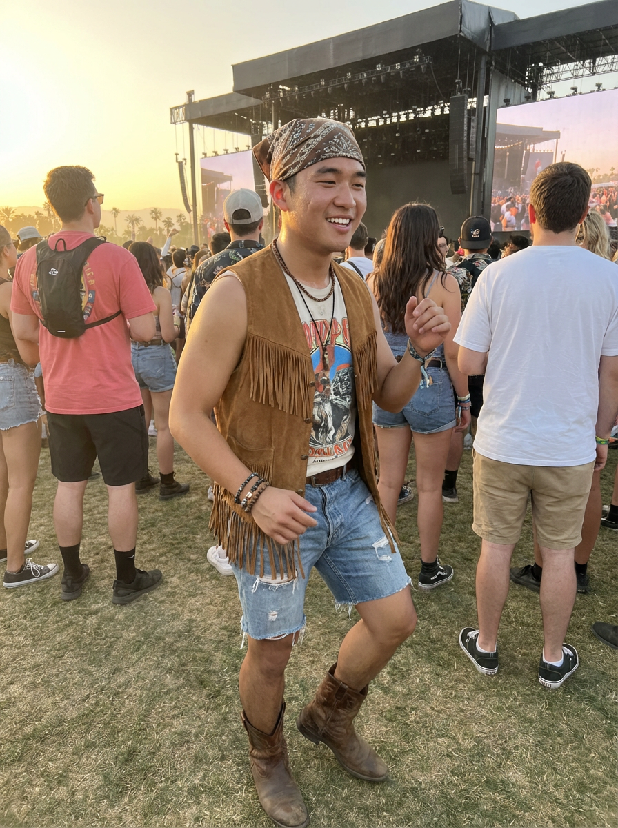 a model in a Coachella-inspired outfit, dancing with a crowd of fellow festival-goers, capturing the energetic atmosphere of the main stage at sunset