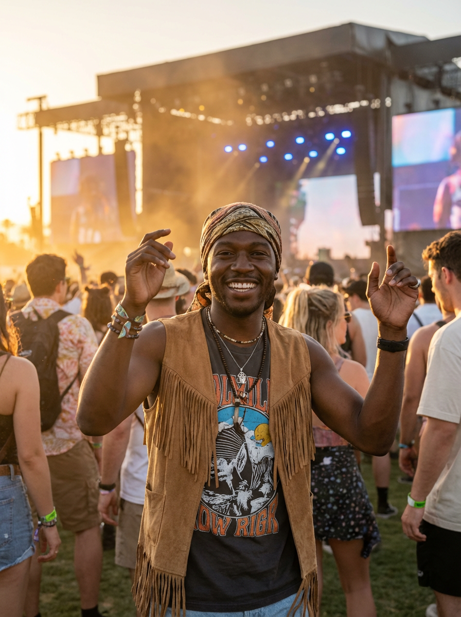 a model in a Coachella-inspired outfit, dancing with a crowd of fellow festival-goers, capturing the energetic atmosphere of the main stage at sunset