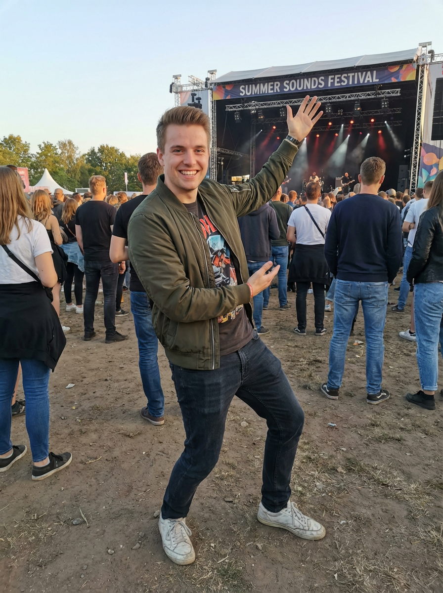 a model in a cool bomber jacket and sneakers, striking a pose in front of a stage backdrop, capturing the excitement of a music festival