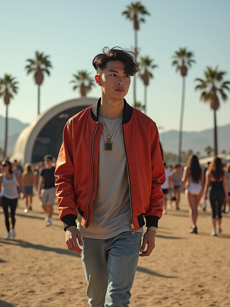 a model in a cool bomber jacket and sneakers, striking a pose in front of the Coachella stage, with palm trees and desert landscape visible