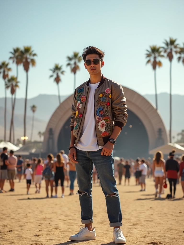 a model in a cool bomber jacket and sneakers, striking a pose in front of the Coachella stage, with palm trees and desert landscape visible