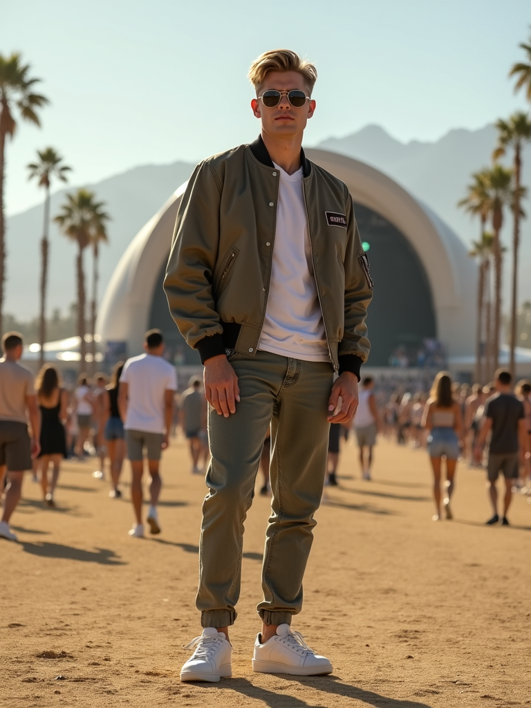 a model in a cool bomber jacket and sneakers, striking a pose in front of the Coachella stage, with palm trees and desert landscape visible