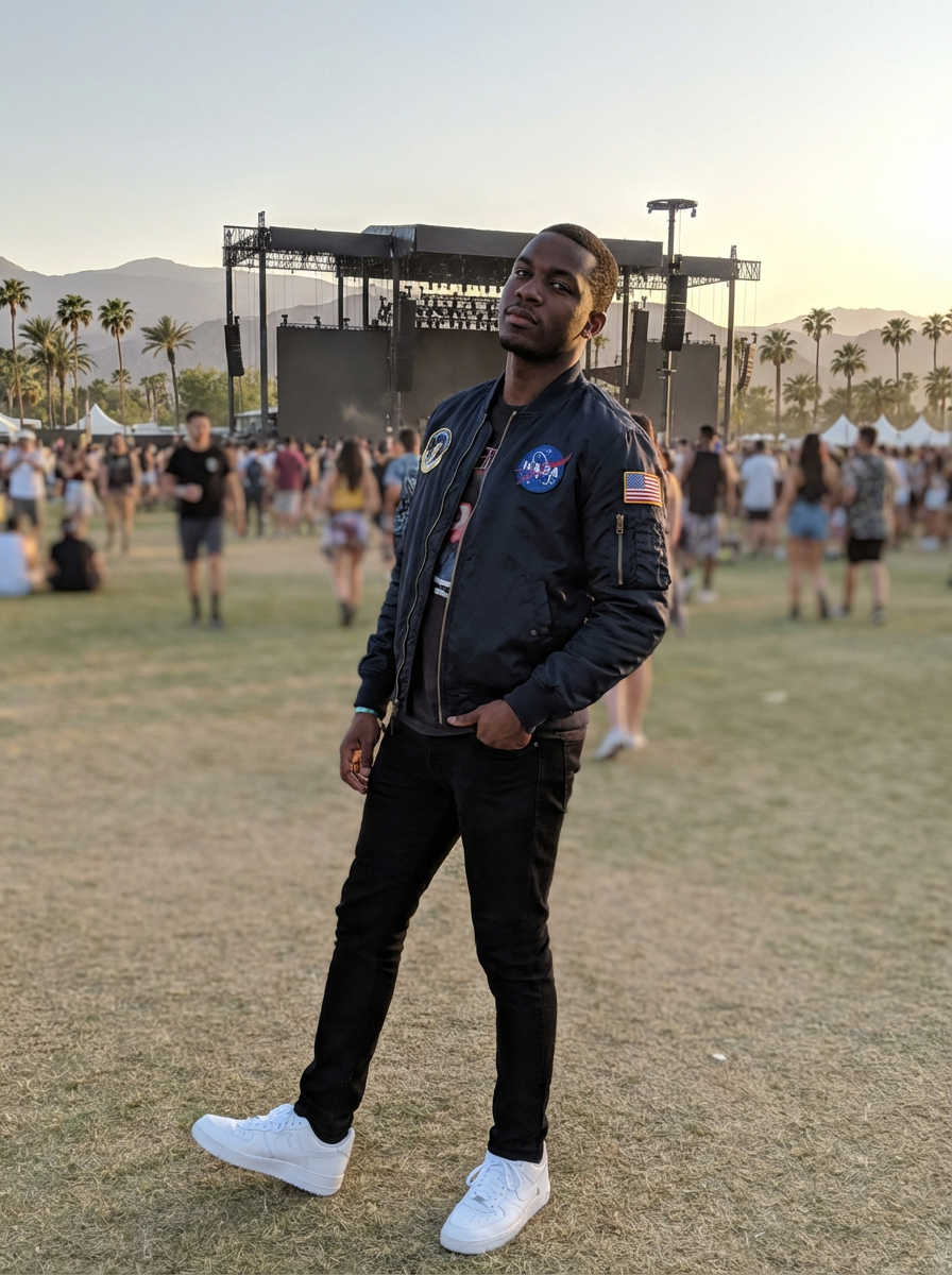 a model in a cool bomber jacket and sneakers, striking a pose in front of the Coachella stage, with palm trees and desert landscape visible