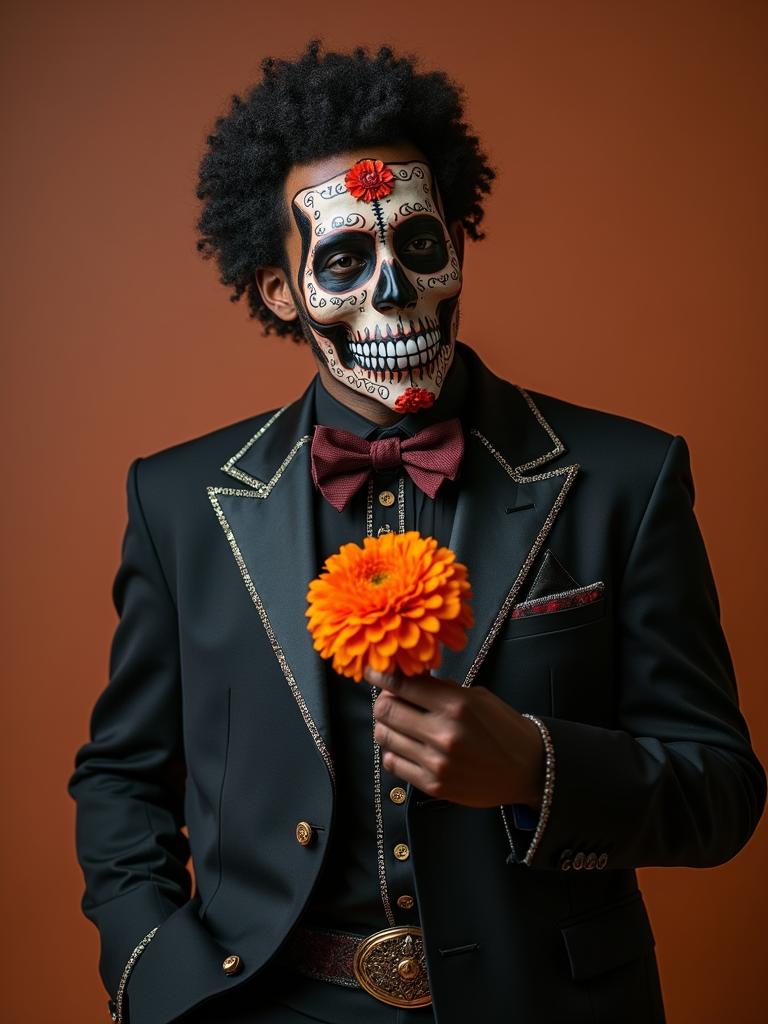 a model in a crisp dark suit with traditional Mexican details, embodying the joyful and spiritual nature of Day of the Dead, with a sugar skull or marigold in hand