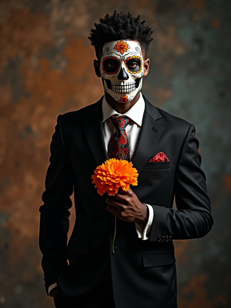 a model in a crisp dark suit with traditional Mexican details, embodying the joyful and spiritual nature of Day of the Dead, with a sugar skull or marigold in hand