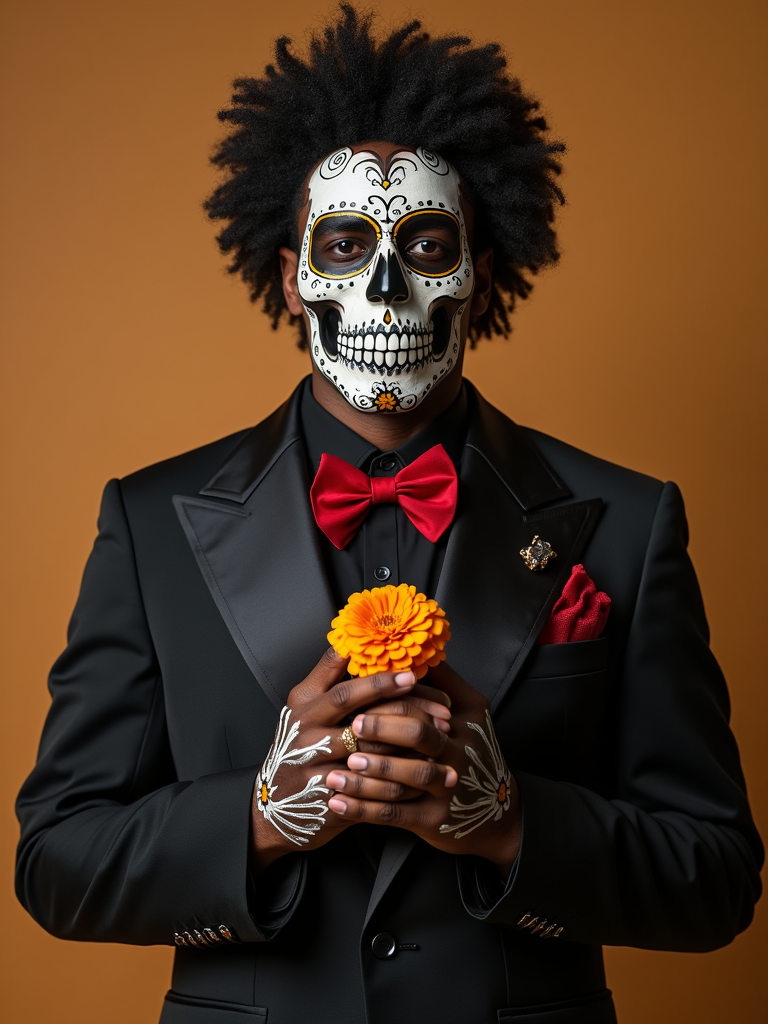 a model in a crisp dark suit with traditional Mexican details, embodying the joyful and spiritual nature of Day of the Dead, with a sugar skull or marigold in hand