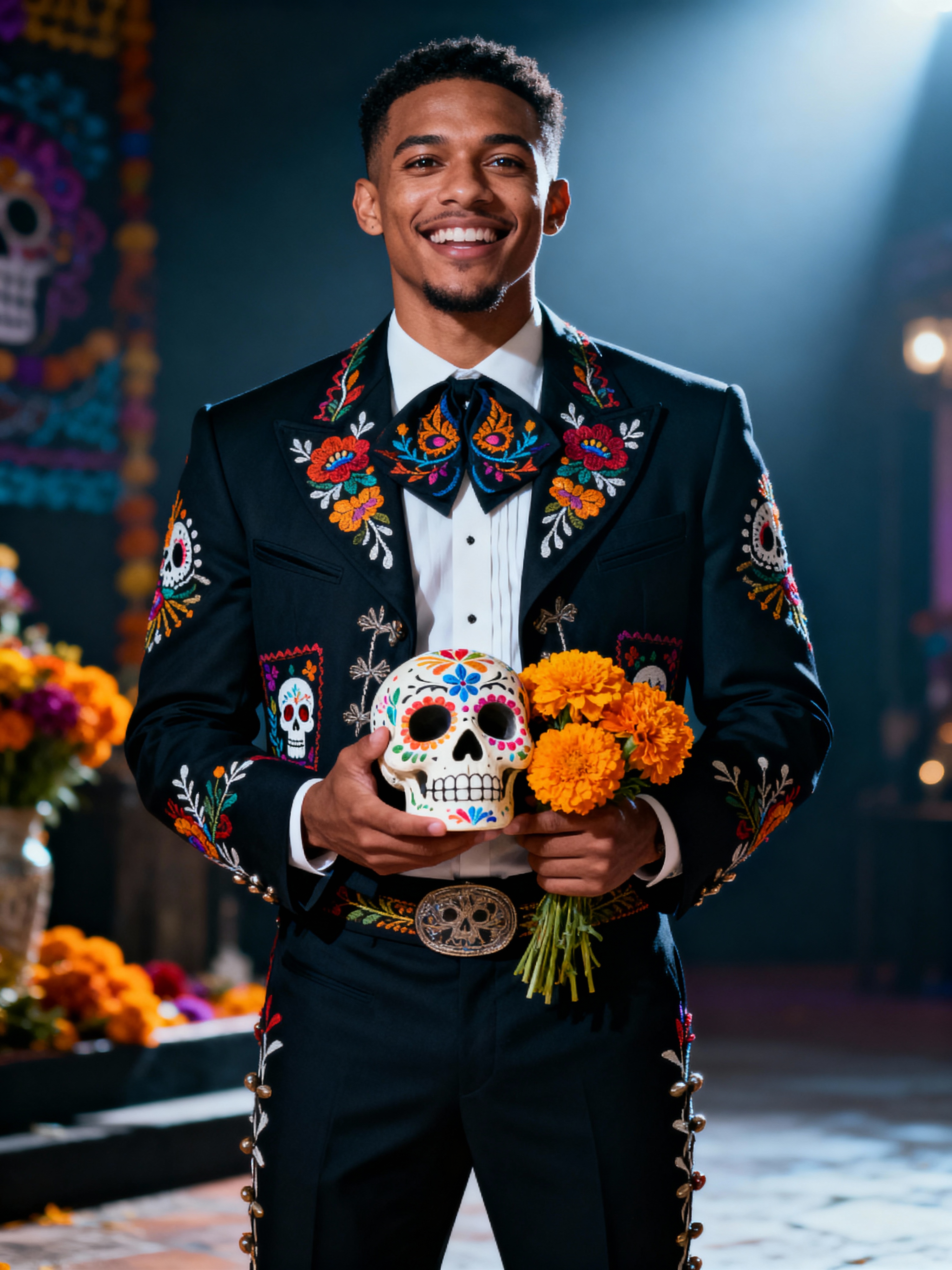 a model in a crisp dark suit with traditional Mexican details, embodying the joyful and spiritual nature of Day of the Dead, with a sugar skull or marigold in hand