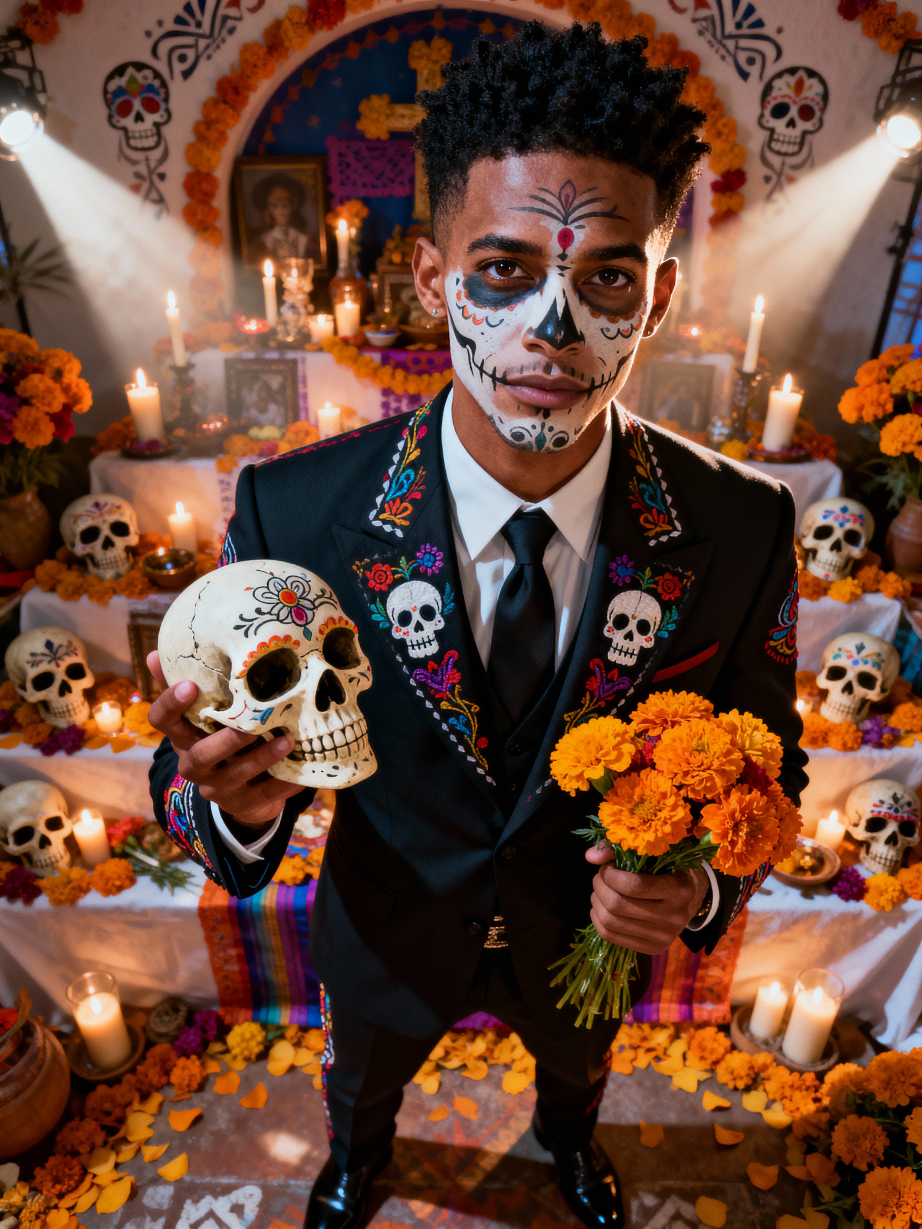 a model in a crisp dark suit with traditional Mexican details, embodying the joyful and spiritual nature of Day of the Dead, with a sugar skull or marigold in hand