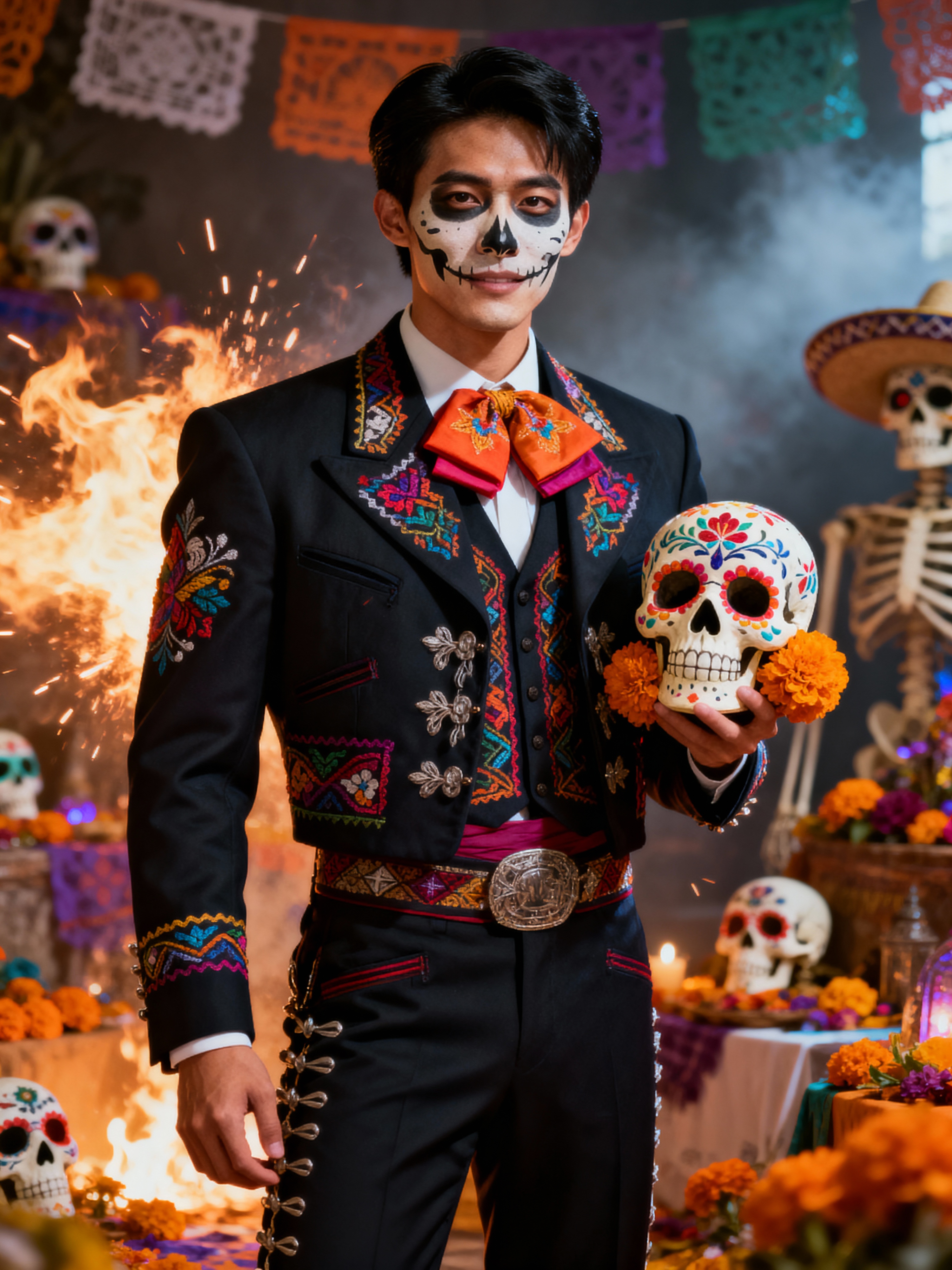 a model in a crisp dark suit with traditional Mexican details, embodying the joyful and spiritual nature of Day of the Dead, with a sugar skull or marigold in hand