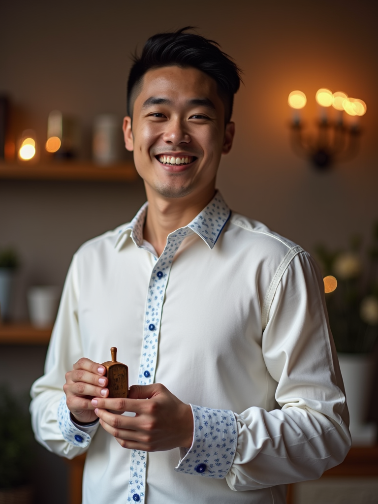 a model in a crisp white shirt with blue accents, embodying the joyful and spiritual nature of Hanukkah, with a dreidel or menorah in hand