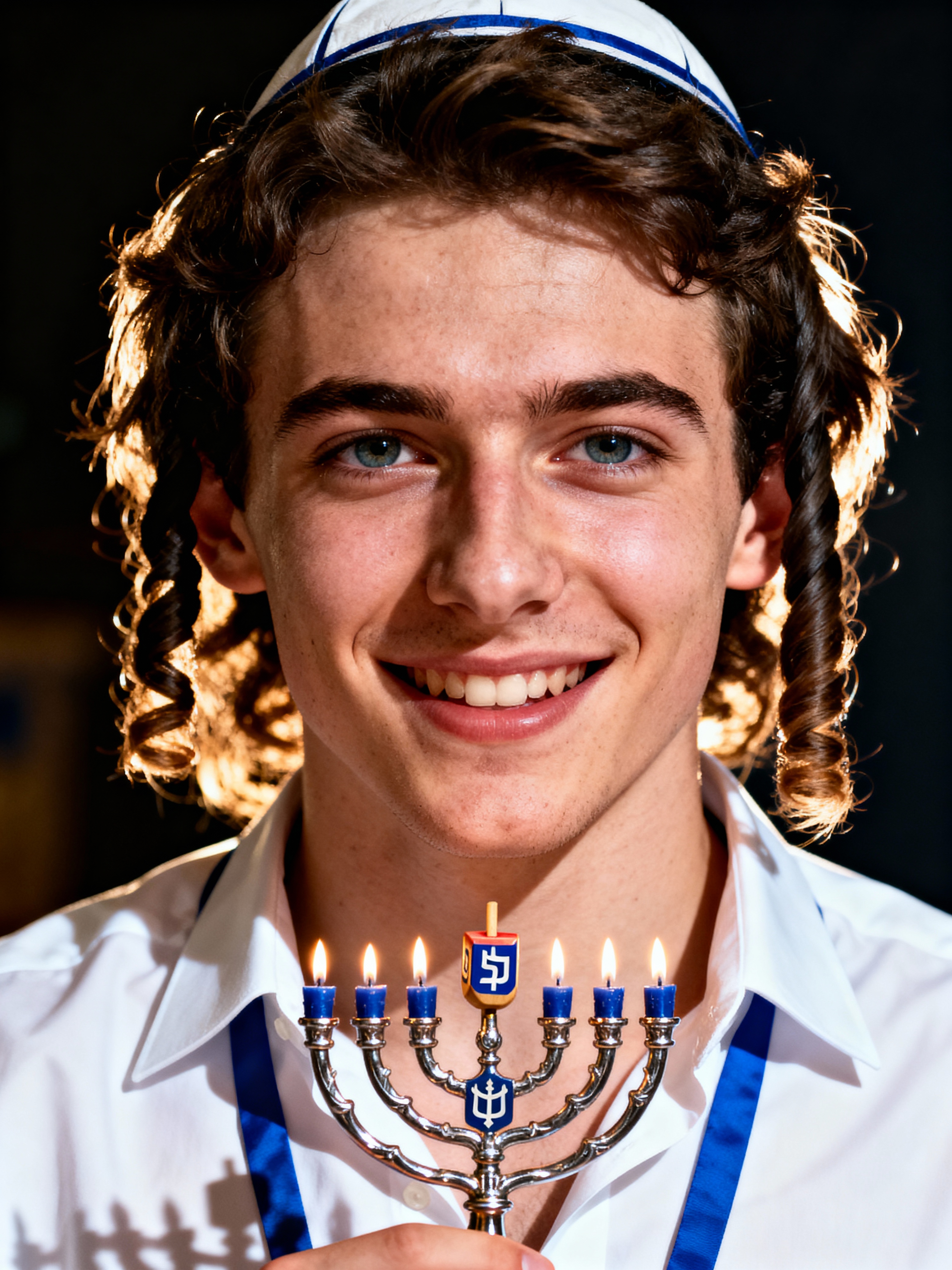 a model in a crisp white shirt with blue accents, embodying the joyful and spiritual nature of Hanukkah, with a dreidel or menorah in hand