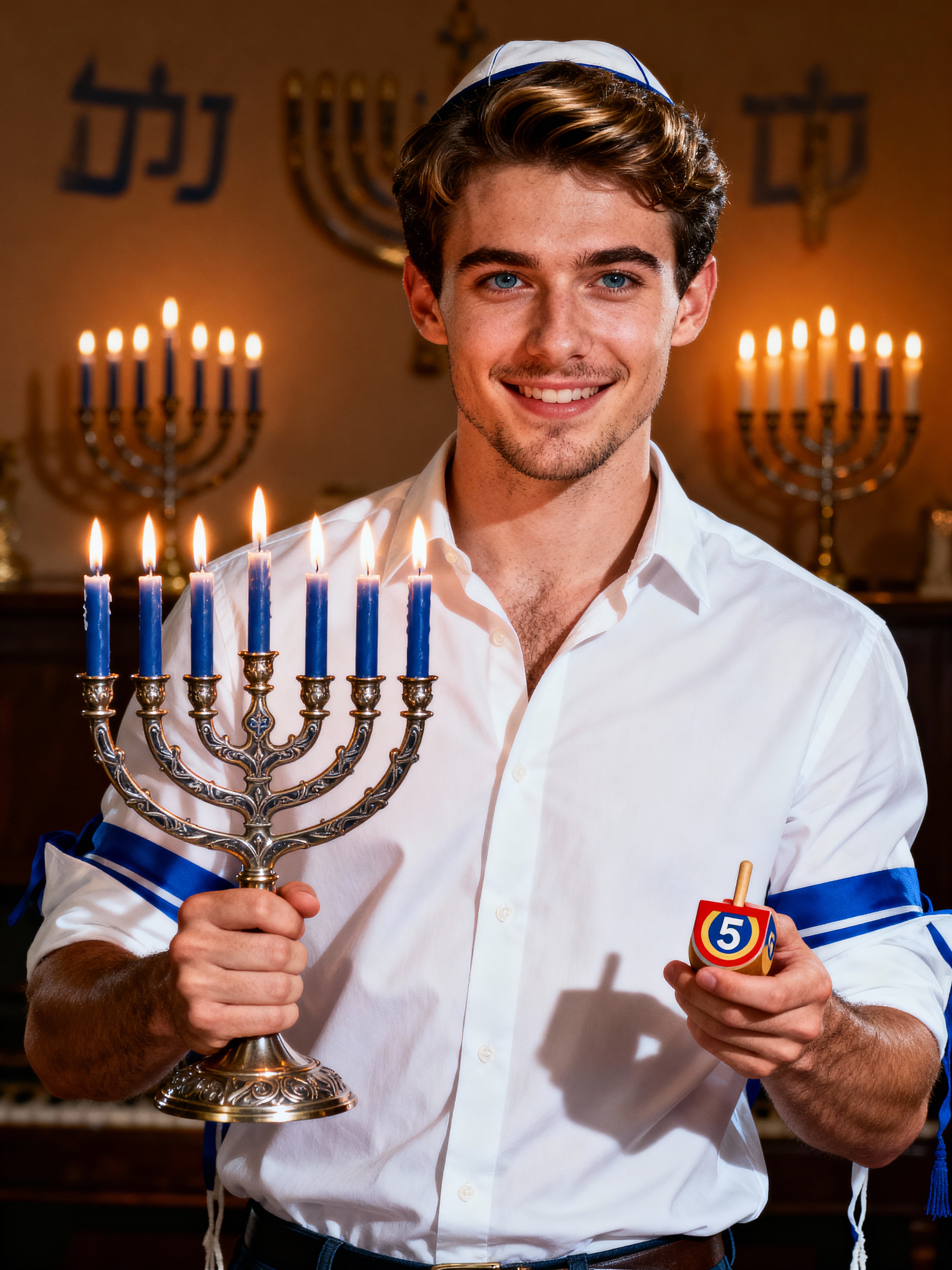 a model in a crisp white shirt with blue accents, embodying the joyful and spiritual nature of Hanukkah, with a dreidel or menorah in hand