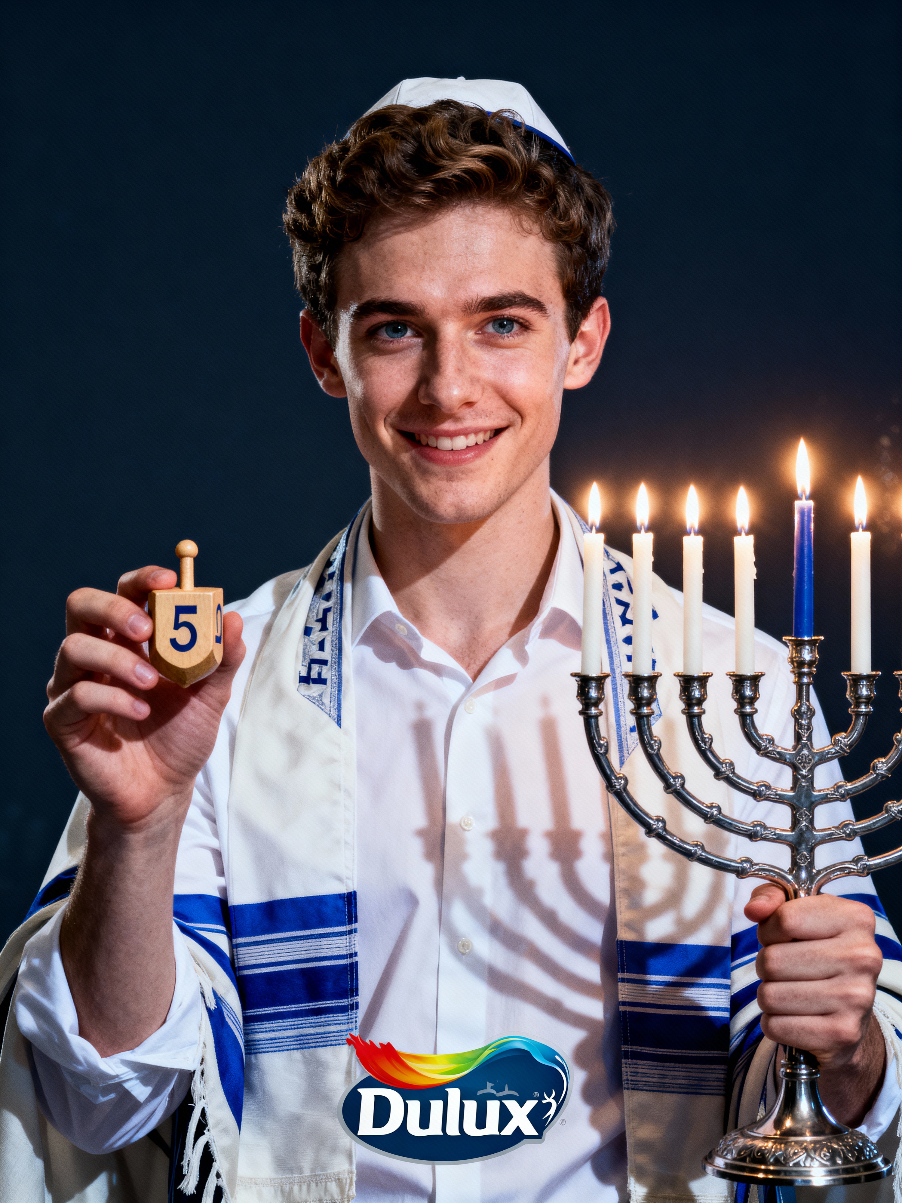 a model in a crisp white shirt with blue accents, embodying the joyful and spiritual nature of Hanukkah, with a dreidel or menorah in hand