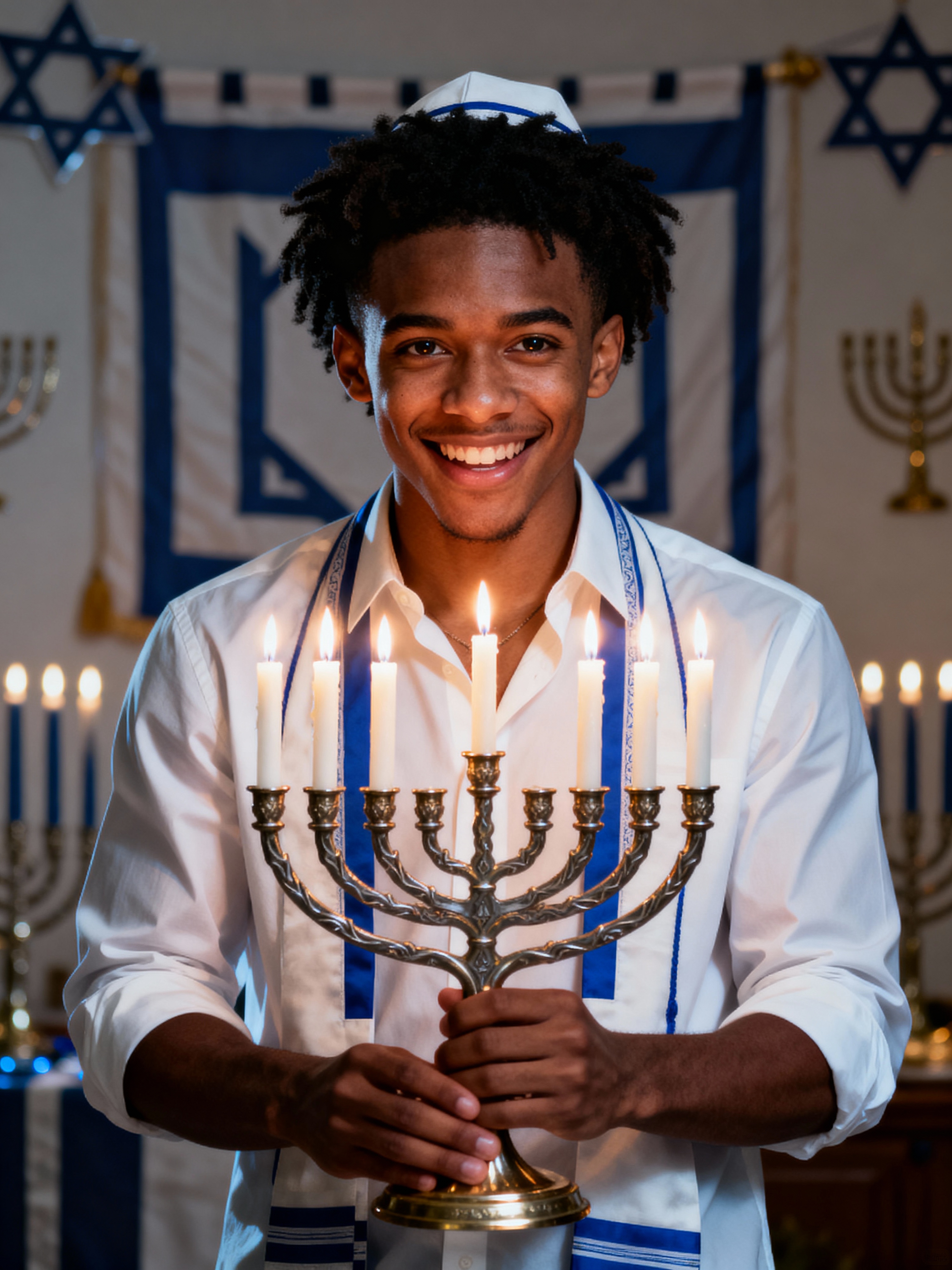 a model in a crisp white shirt with blue accents, embodying the joyful and spiritual nature of Hanukkah, with a dreidel or menorah in hand
