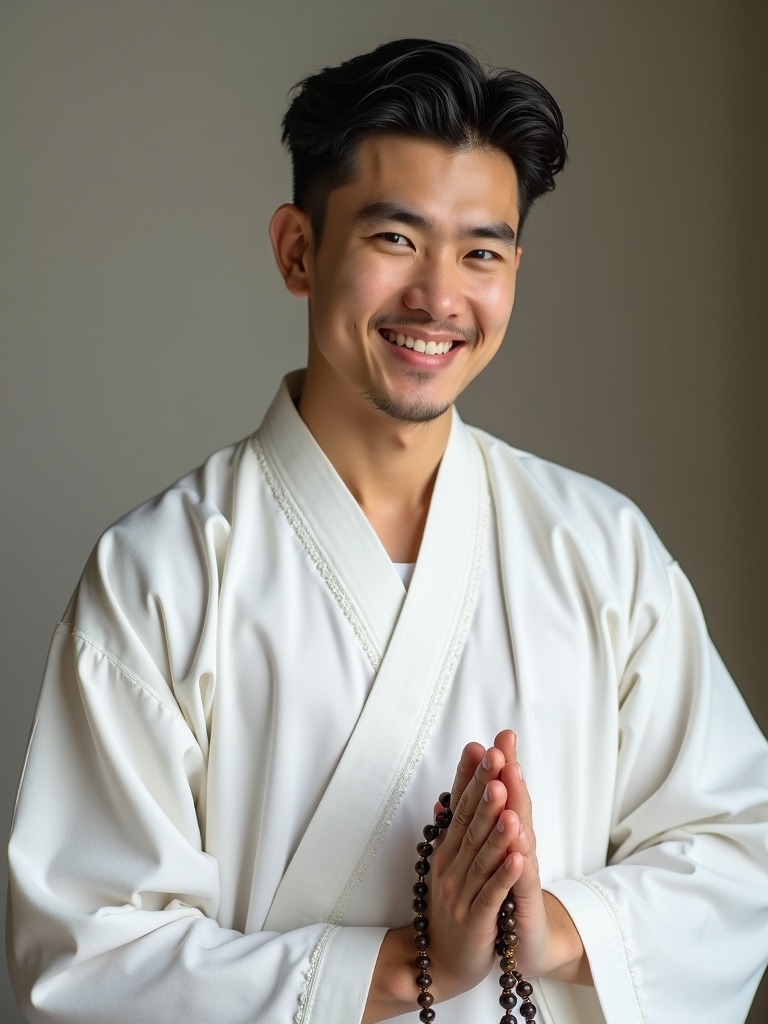 a model in a crisp white thobe with subtle embellishments, embodying the joyful and blessed nature of Eid, with prayer beads in hand
