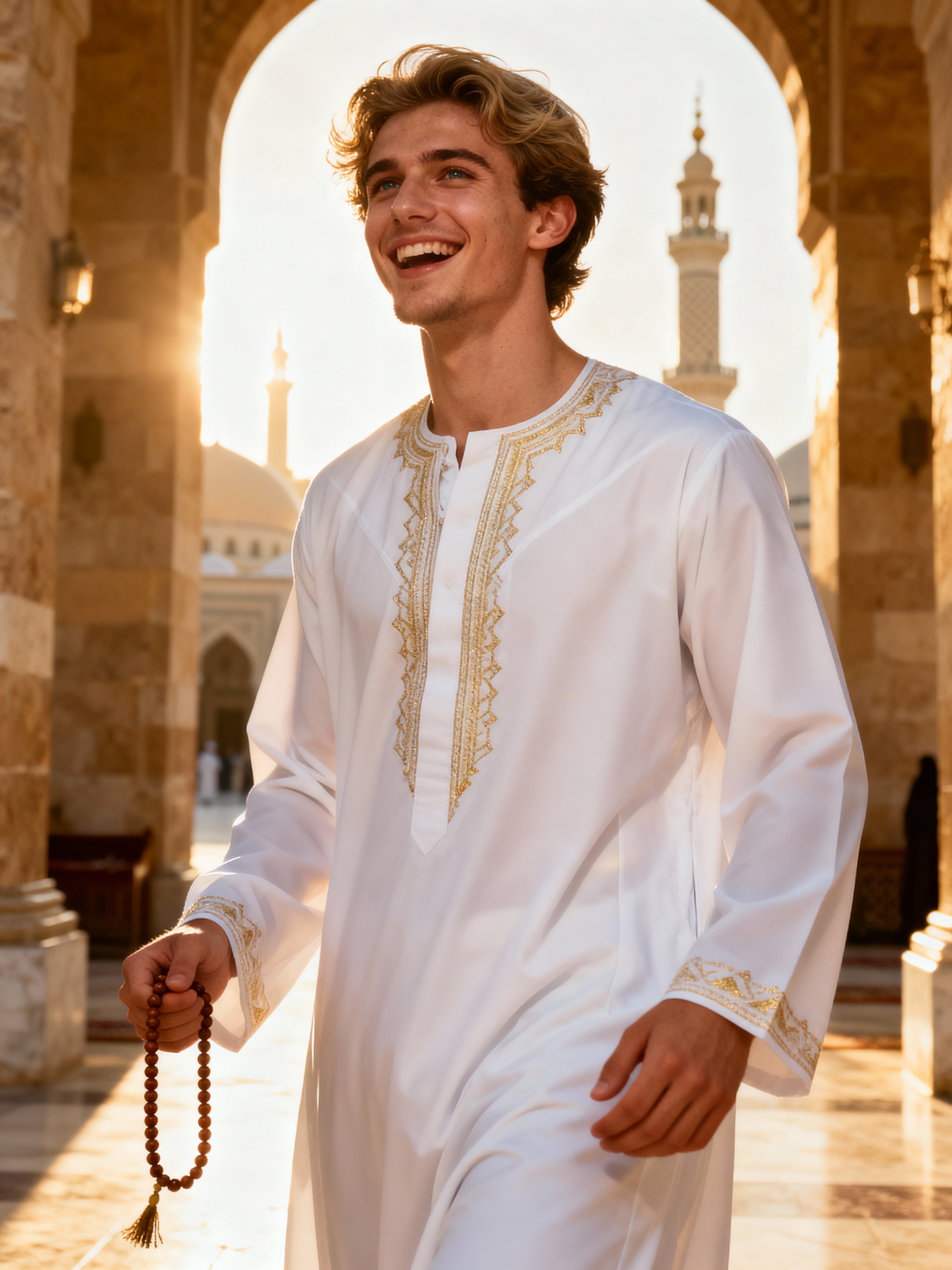 a model in a crisp white thobe with subtle embellishments, embodying the joyful and blessed nature of Eid, with prayer beads in hand