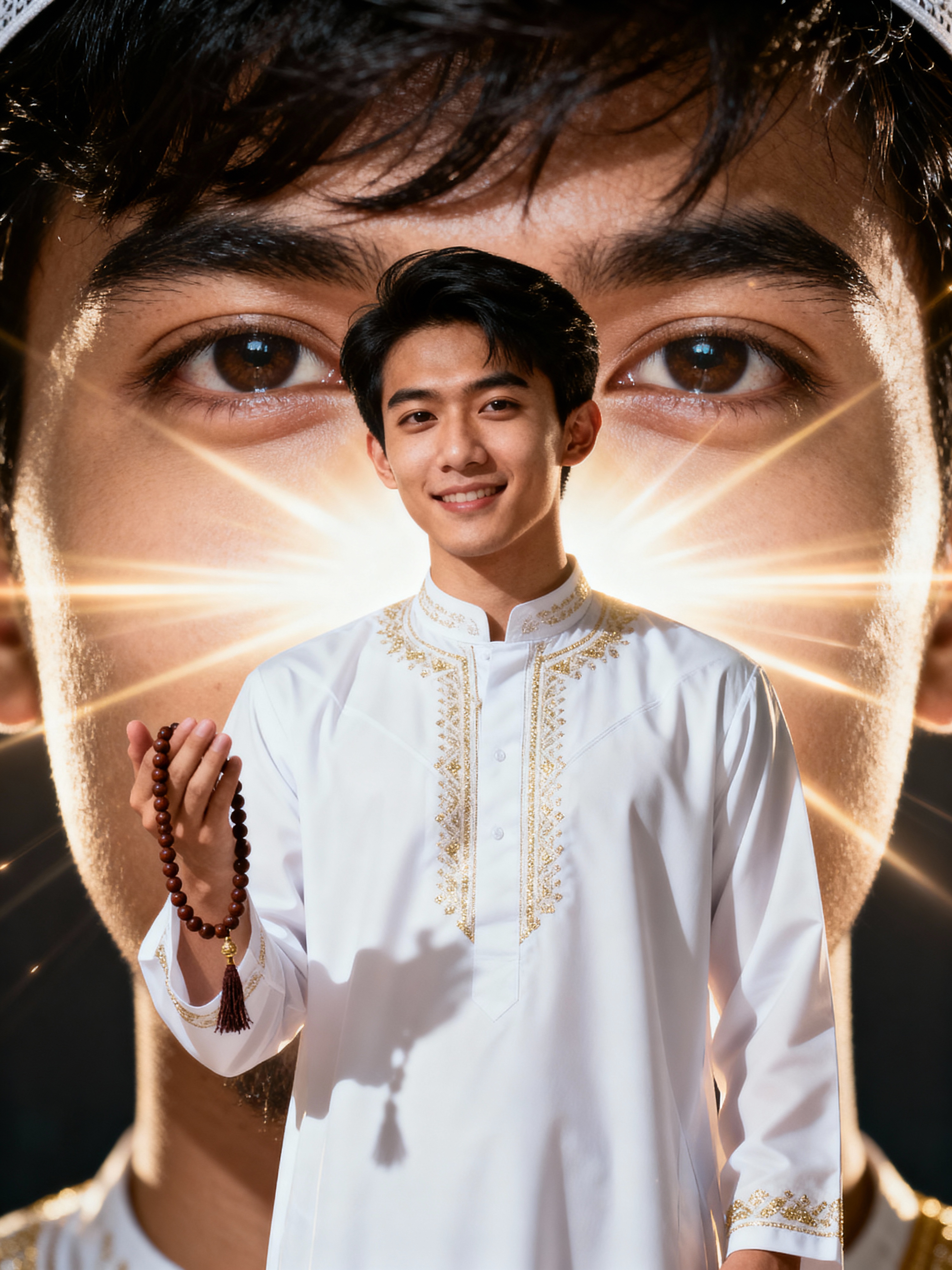 a model in a crisp white thobe with subtle embellishments, embodying the joyful and blessed nature of Eid, with prayer beads in hand