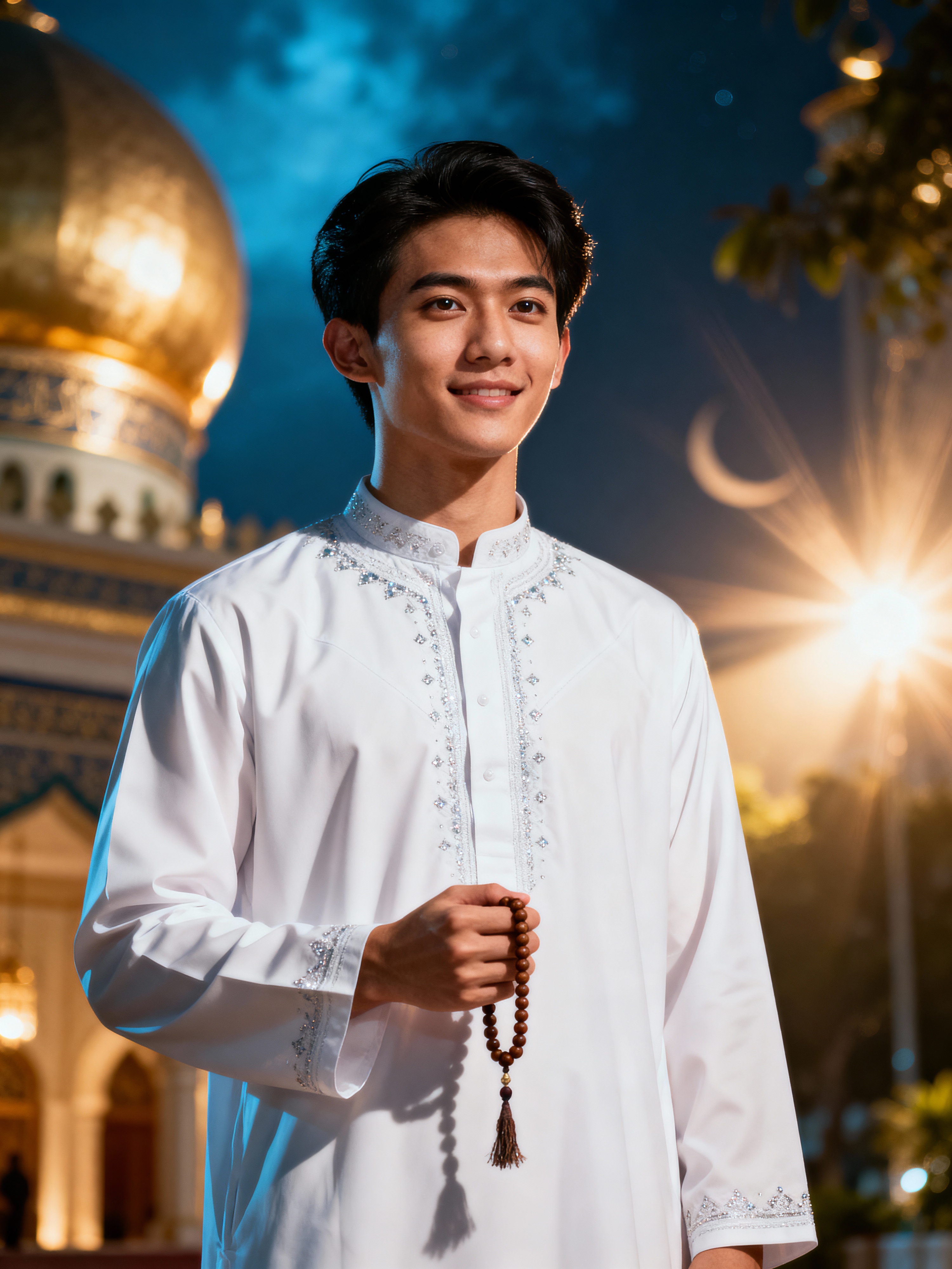 a model in a crisp white thobe with subtle embellishments, embodying the joyful and blessed nature of Eid, with prayer beads in hand