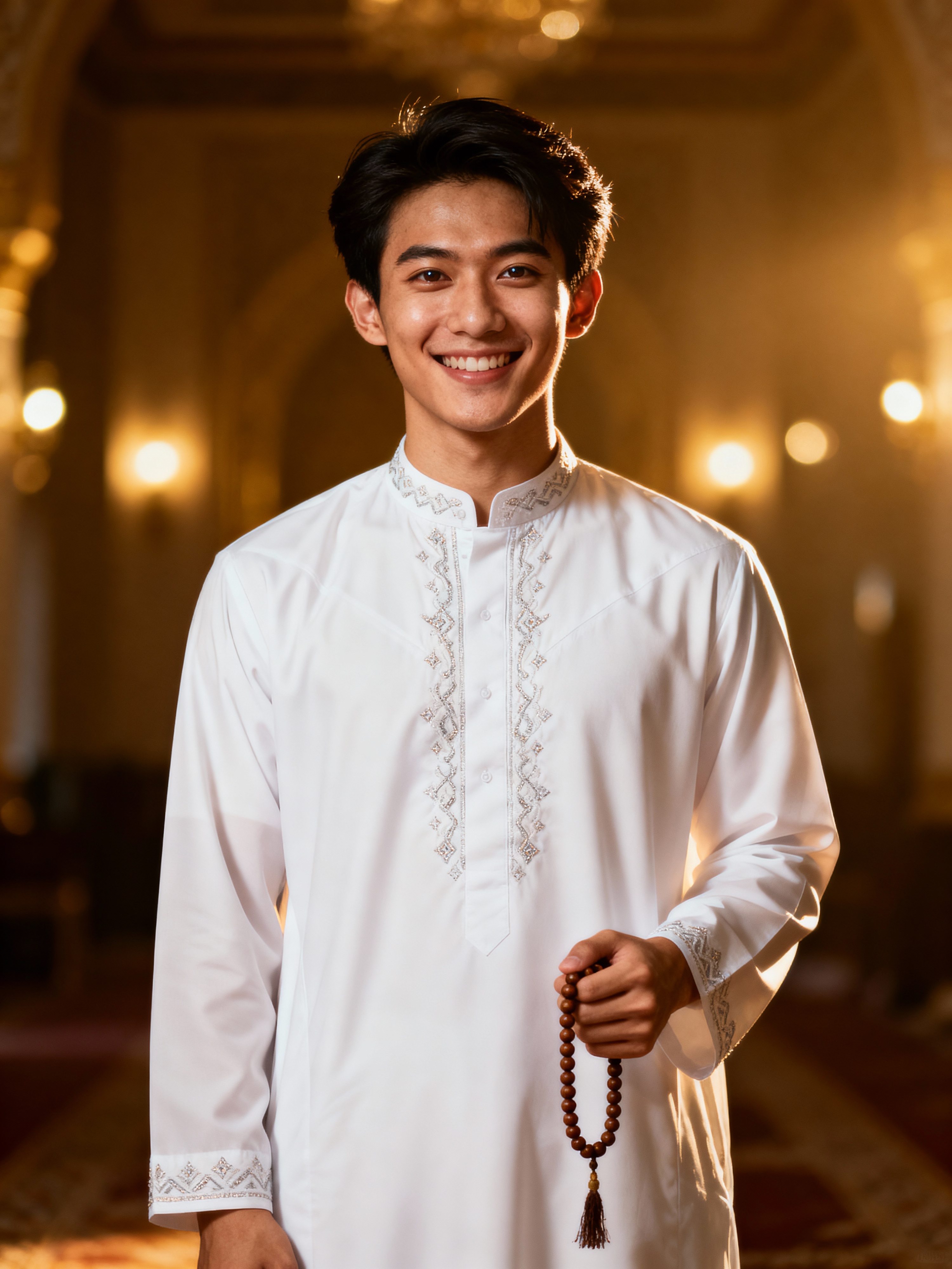 a model in a crisp white thobe with subtle embellishments, embodying the joyful and blessed nature of Eid, with prayer beads in hand