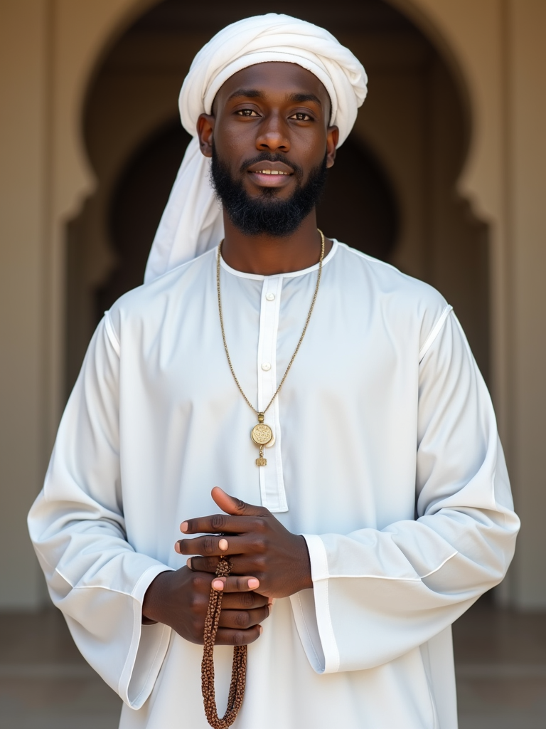 a model in a crisp white thobe with subtle embellishments, embodying the peaceful and reflective nature of Ramadan, with prayer beads in hand