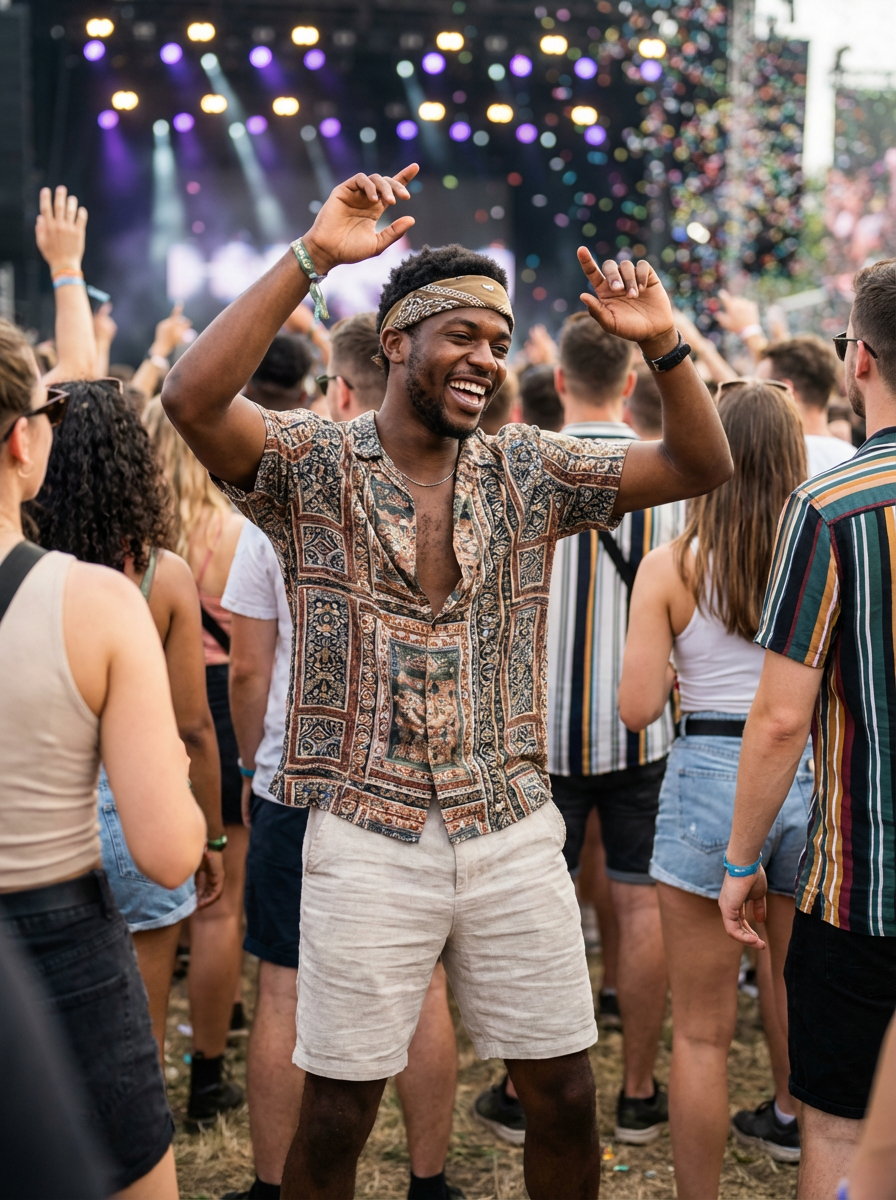 a model in a festival-inspired outfit, dancing with a crowd of fellow festival-goers, capturing the energetic and lively atmosphere