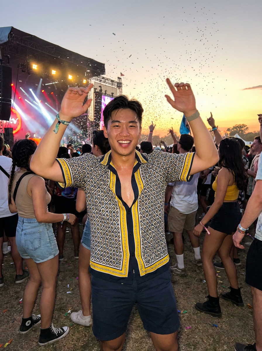 a model in a festival-inspired outfit, dancing with a crowd of fellow festival-goers, capturing the energetic and lively atmosphere