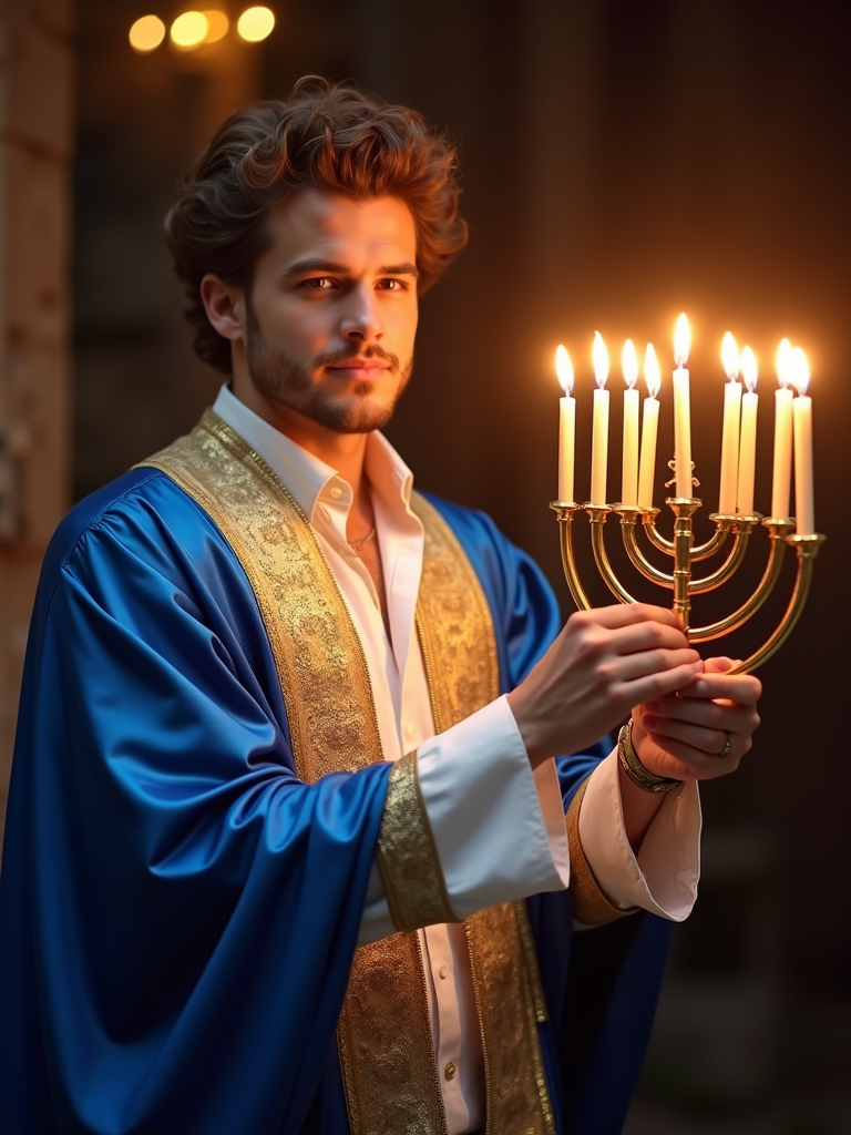a model in a festive blue and white ensemble, striking a pose with a beautiful menorah casting warm golden light patterns