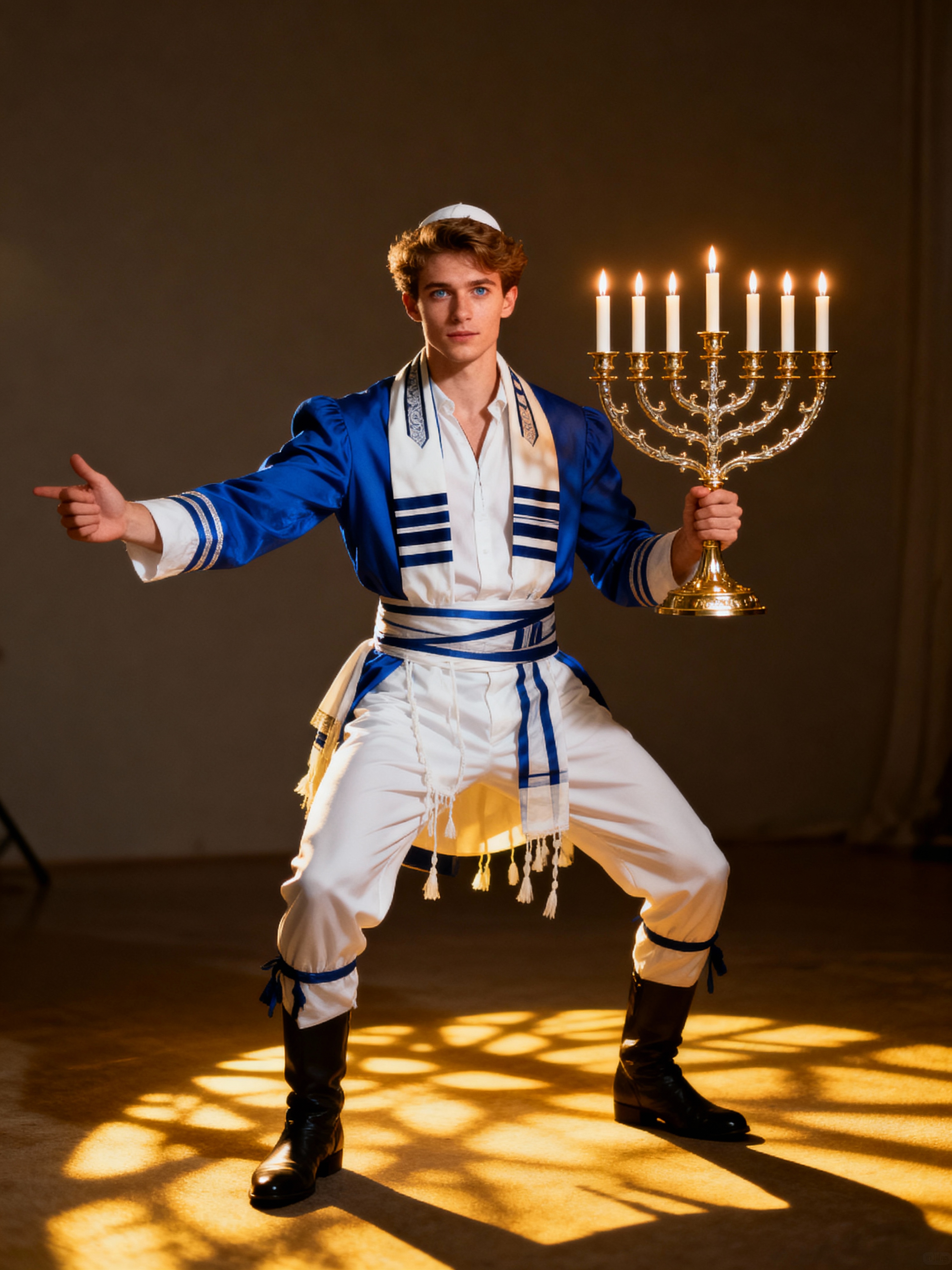 a model in a festive blue and white ensemble, striking a pose with a beautiful menorah casting warm golden light patterns