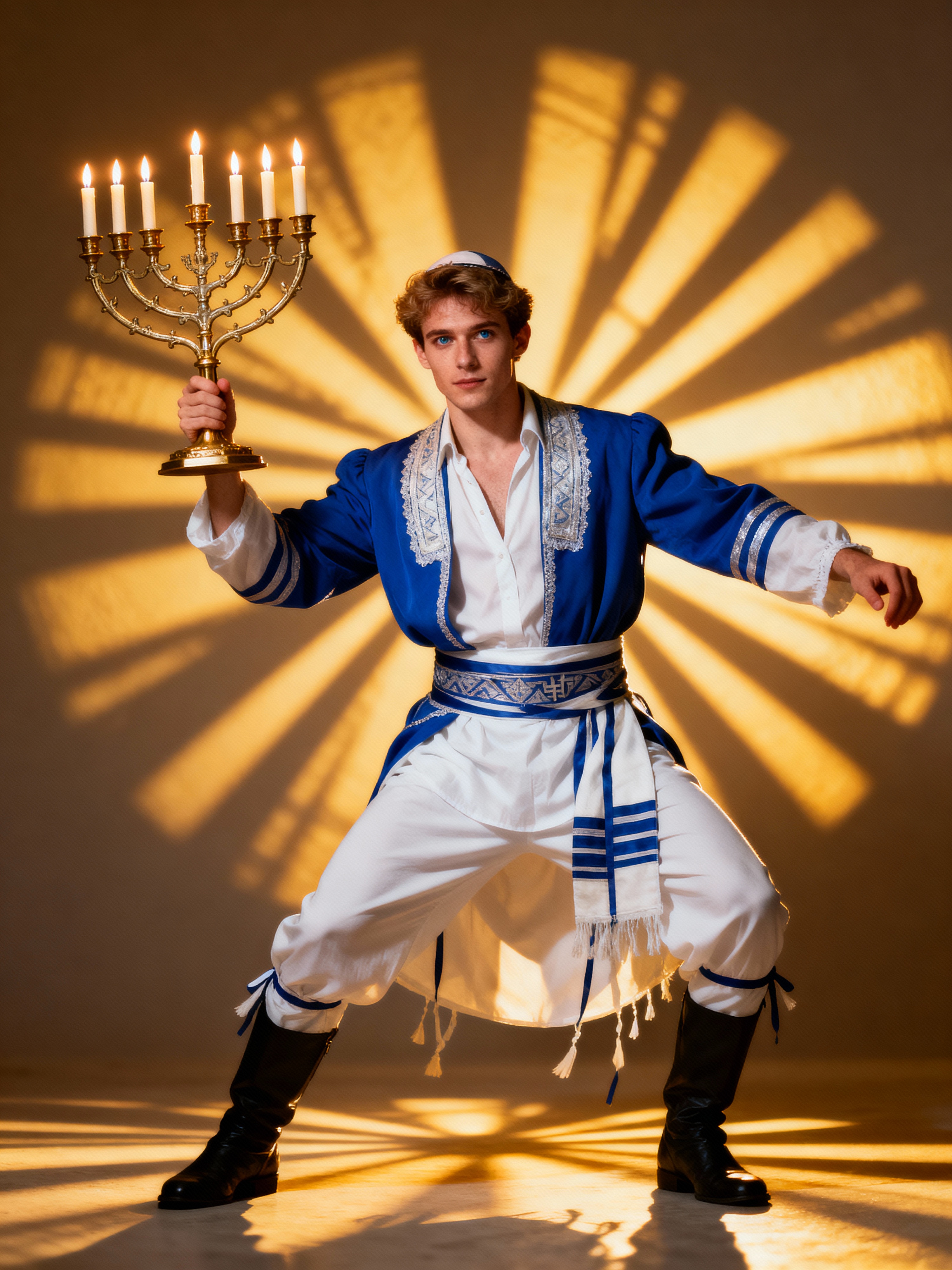 a model in a festive blue and white ensemble, striking a pose with a beautiful menorah casting warm golden light patterns