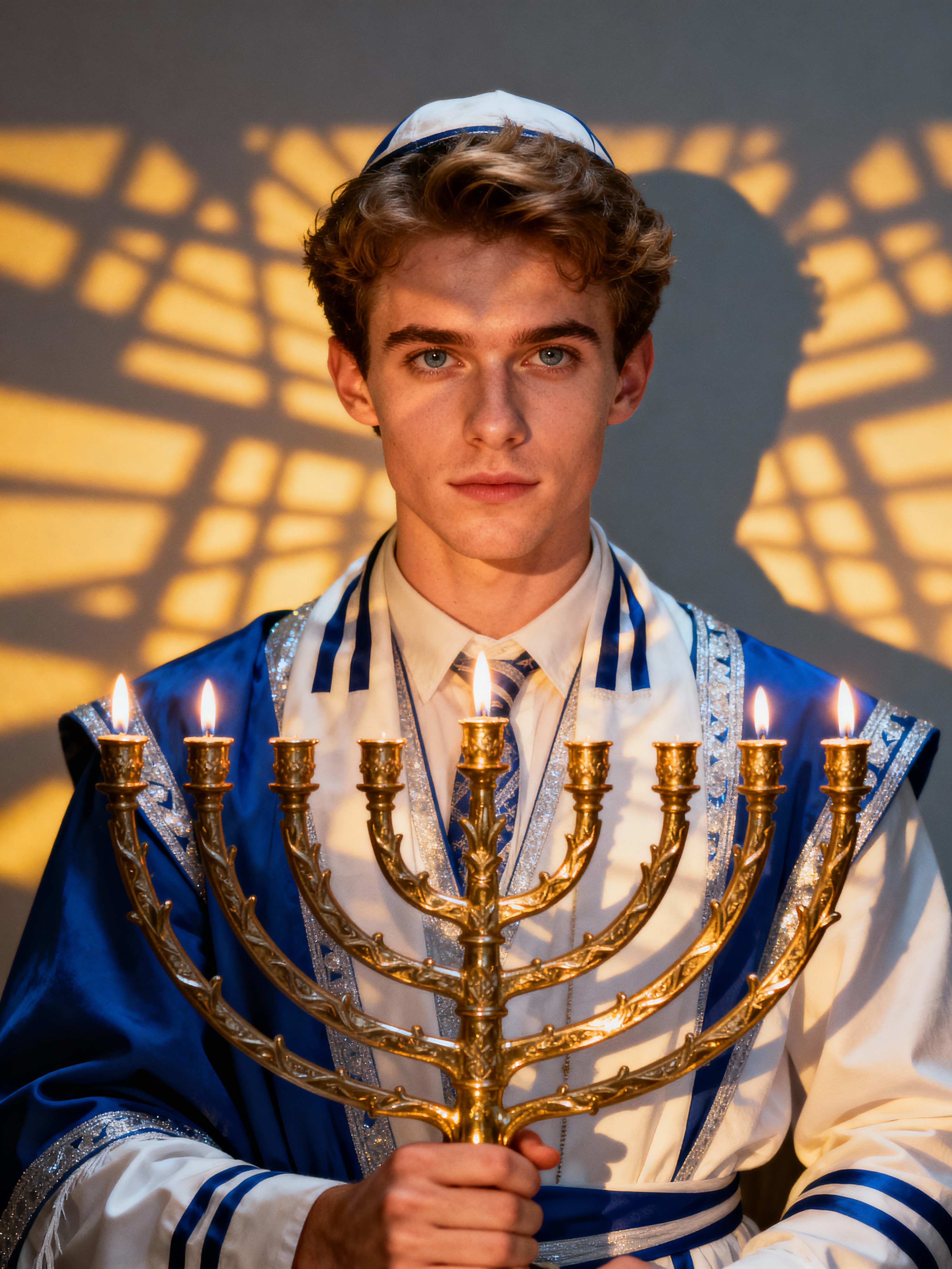a model in a festive blue and white ensemble, striking a pose with a beautiful menorah casting warm golden light patterns