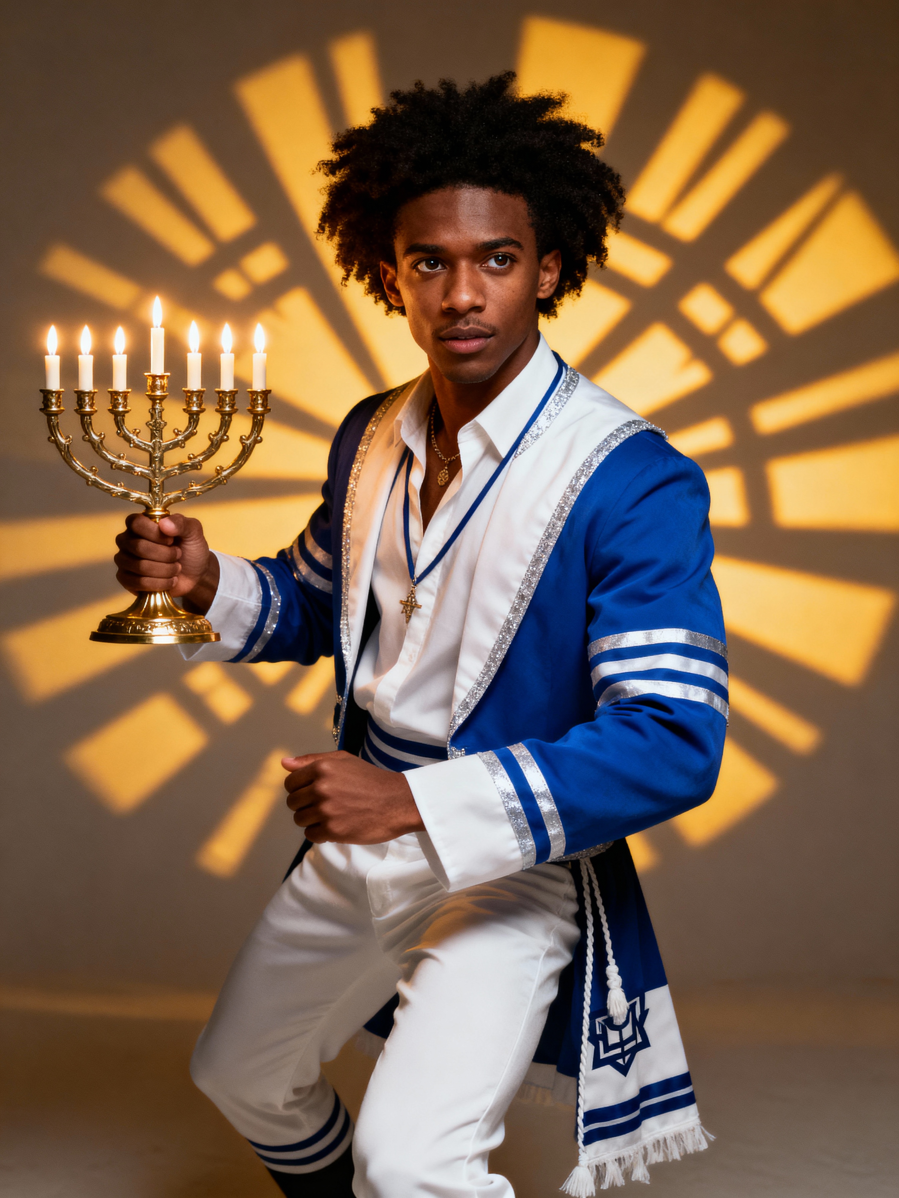 a model in a festive blue and white ensemble, striking a pose with a beautiful menorah casting warm golden light patterns