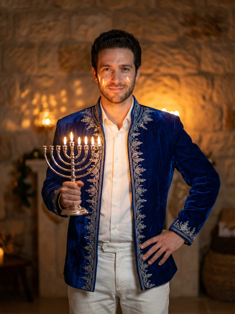 a model in a festive blue and white ensemble, striking a pose with a beautiful menorah casting warm golden light patterns