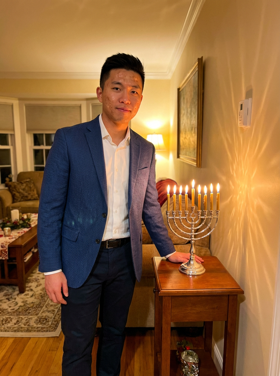 a model in a festive blue and white ensemble, striking a pose with a beautiful menorah casting warm golden light patterns
