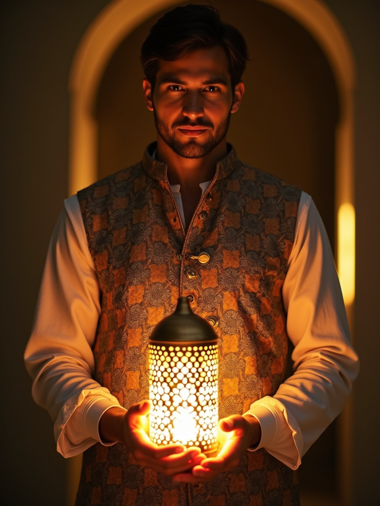 a model in a festive kurta with traditional vest, striking a pose with a beautiful Ramadan lantern casting intricate light patterns