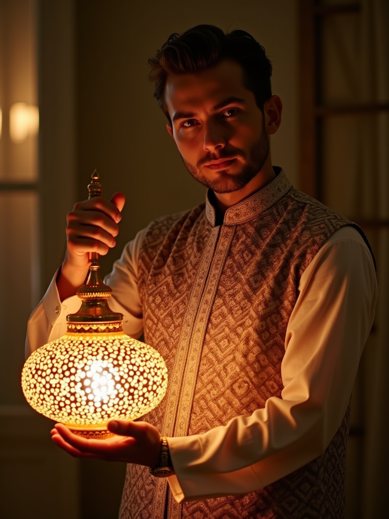 a model in a festive kurta with traditional vest, striking a pose with a beautiful Ramadan lantern casting intricate light patterns