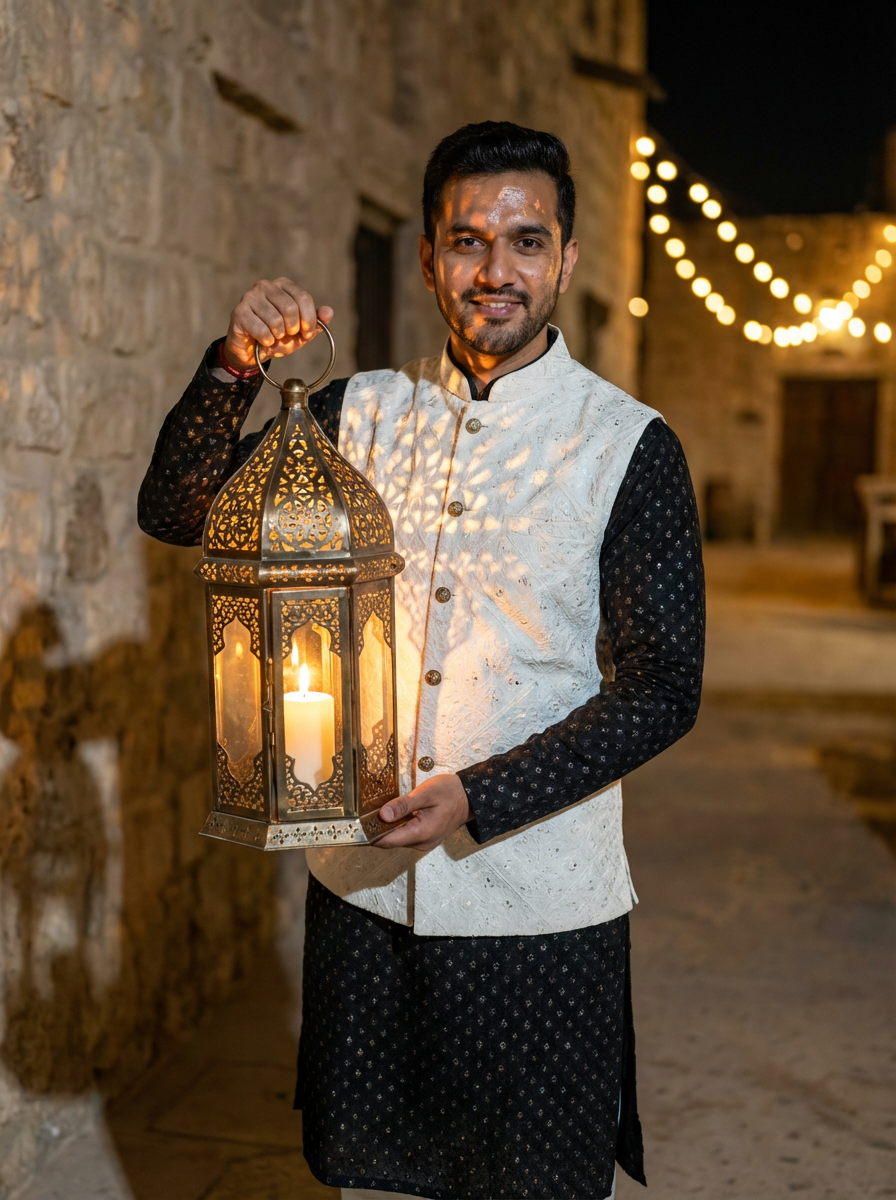 a model in a festive kurta with traditional vest, striking a pose with a beautiful Ramadan lantern casting intricate light patterns