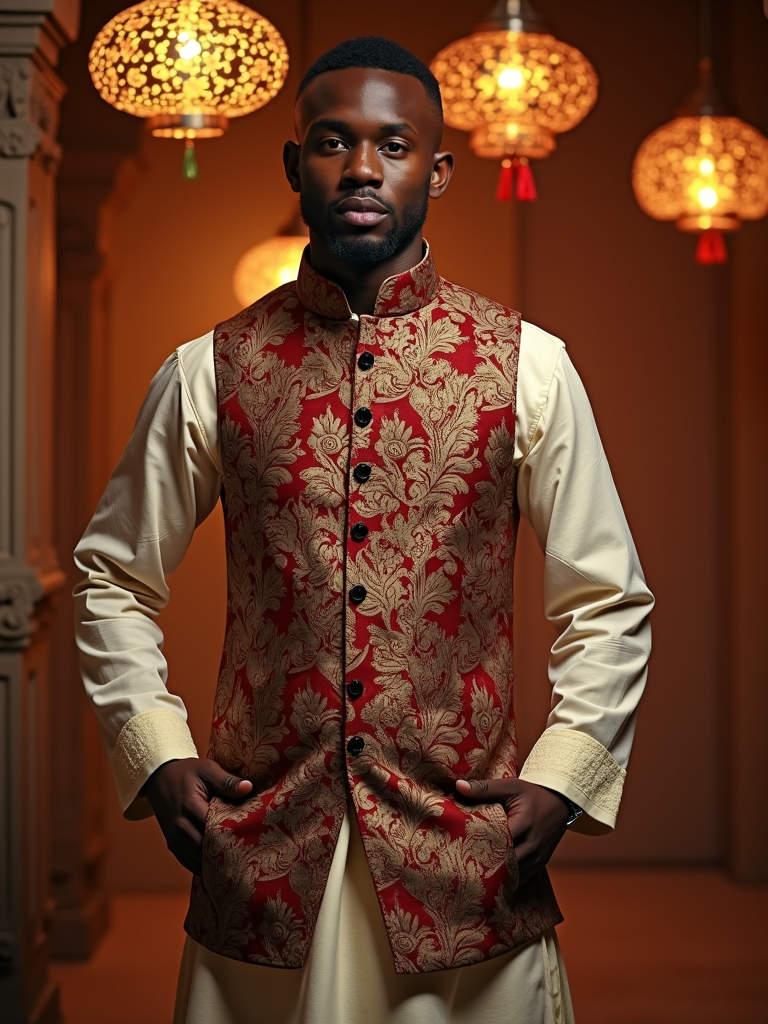 a model in a festive kurta with traditional vest, striking a pose with beautiful Eid decorations casting intricate light patterns