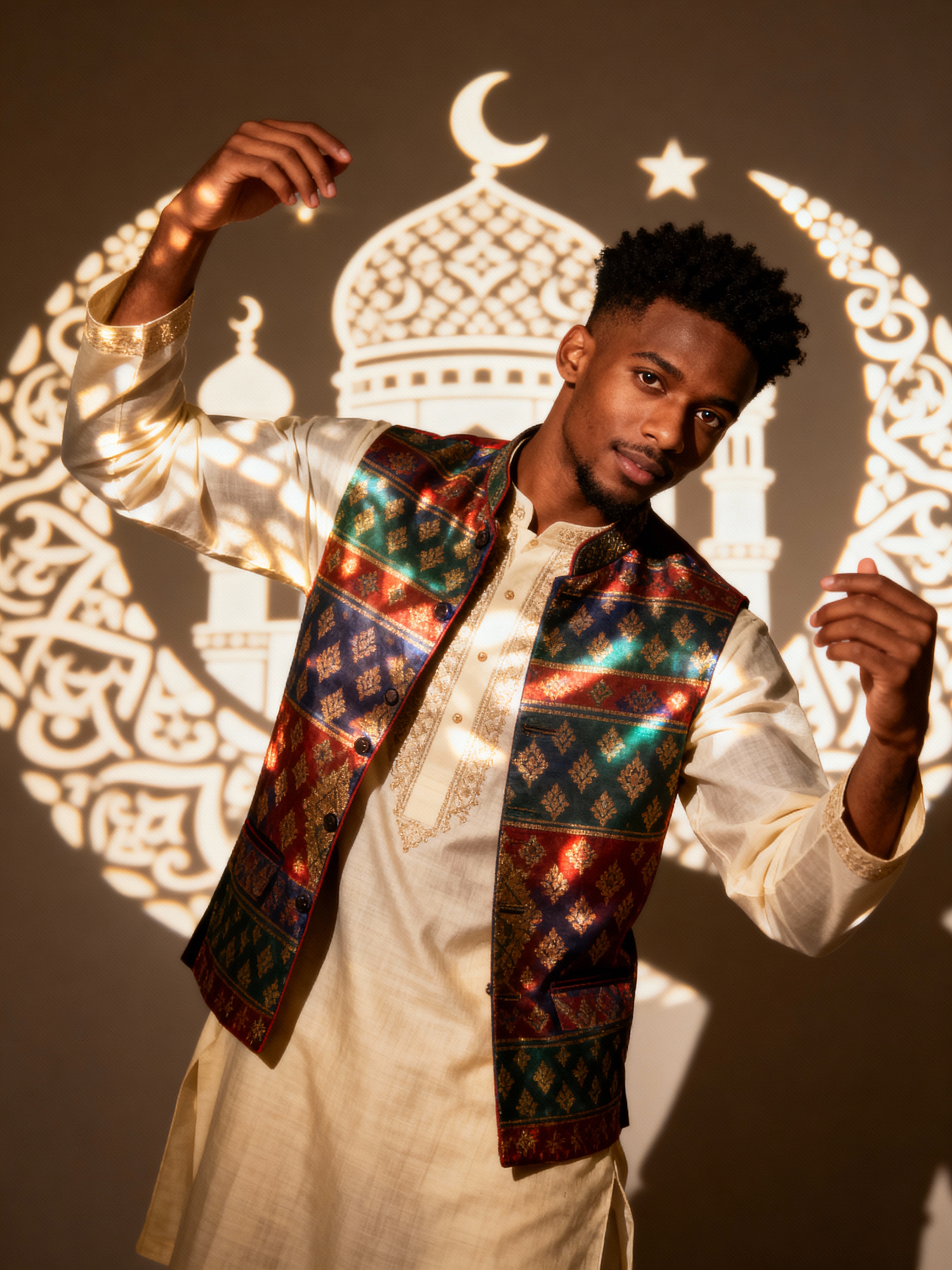 a model in a festive kurta with traditional vest, striking a pose with beautiful Eid decorations casting intricate light patterns