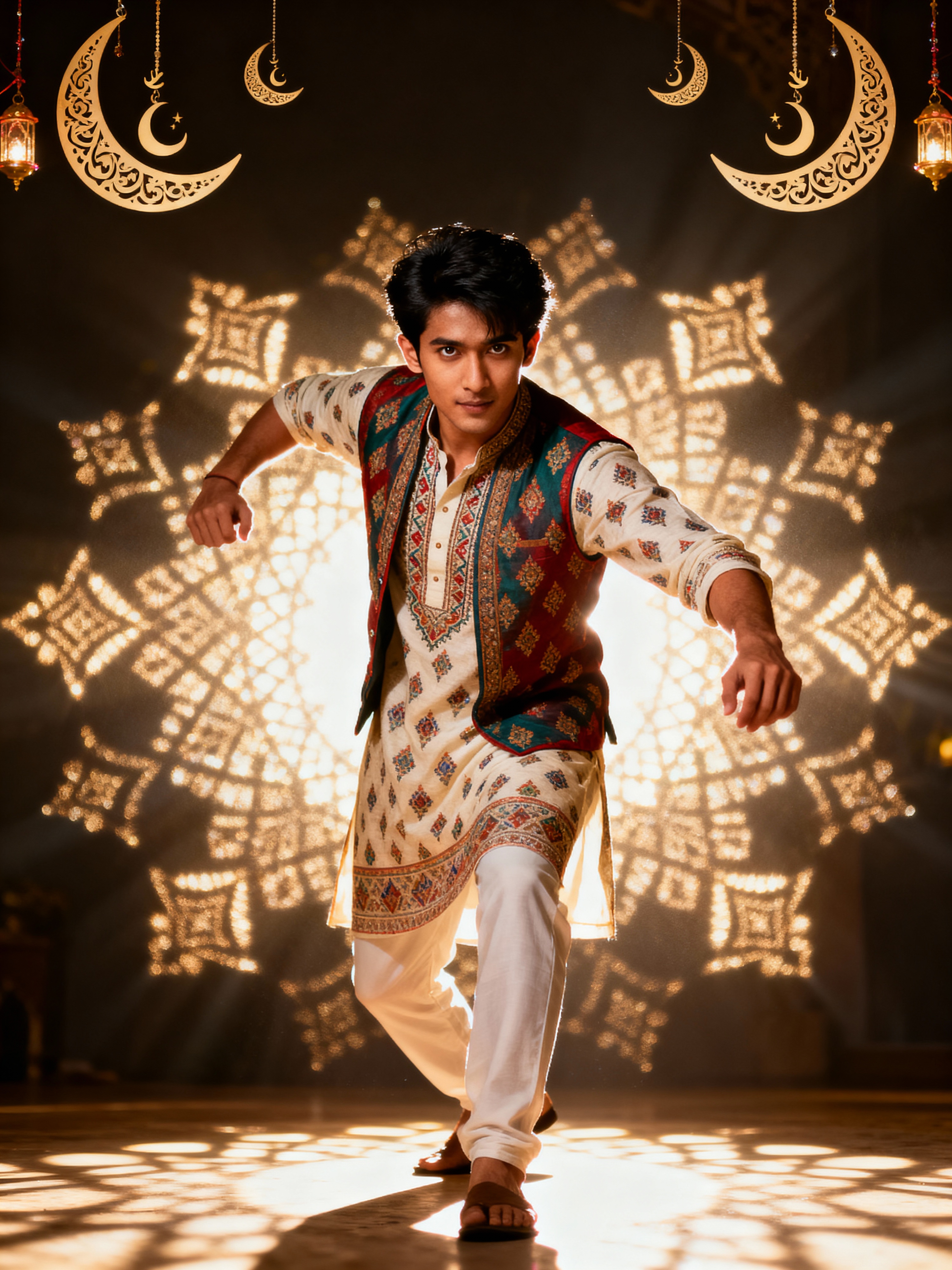 a model in a festive kurta with traditional vest, striking a pose with beautiful Eid decorations casting intricate light patterns